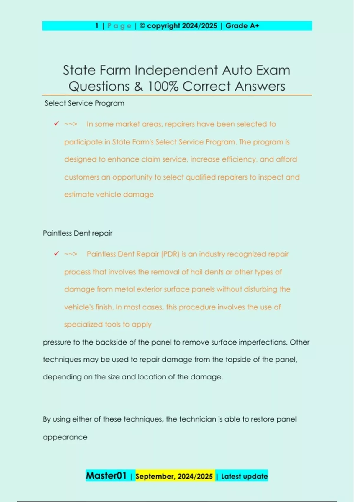 Select Service Program ~~> In some market areas, repairers have been selected to participate in State Farm's Select Service Program. The program is designed to enhance claim service, increase efficiency, and afford customers an opportunity to select qualified repairers to inspect and estimate vehicle damage Paintless Dent repair ~~> Paintless Dent Repair (PDR) is an industry recognized repair process that involves the removal of hail dents or other types of damage from metal exterior surface panels without disturbing the vehicle's finish. In most cases, this procedure involves the use of specialized tools to apply pressure to the backside of the panel to remove surface imperfections. Other techniques may be used to repair damage from the topside of the panel, depending on the size and location of the damage. By using either of these techniques, the technician is able to restore panel appearance 2 | P a g e | © copyright 2024/2025 | Grade A+ Master01 | September, 2024/2025 | Latest update which eliminates the need for refinishing the panel's surface area. The PDR process is often used to repair hail damage or other similar dents that occur when an outer panel strikes (or is struck by) an object that has not compromised the finish of the panel. Since the outer finish of the panel has not been disturbed, it eliminates the refinishing process and may allow for repairs to be completed in a more timely and cost effective manner. Determining Repair Costs ~~> The prices we pay for most repair operations will be determined from printed or electronic collision estimating guides and repair facility survey results. However, it is not possible to determine the cost of every repair operation from these sources. For example, when estimating a sheet metal or other repair operation, the labor estimate is based on judgment time. When estimating judgment time, it should follow what is competitive in the local market to repair the vehicle in a quality manner. Estimats are based on 3 | P a g e | © copyright 2024/2025 | Grade A+ Master01 | September, 2024/2025 | Latest update ~~> Estimates written or approved by State Farm are based on labor rates and repair costs not to exceed what is charged by a majority of the repair market in a given area. Contracts with repairers
