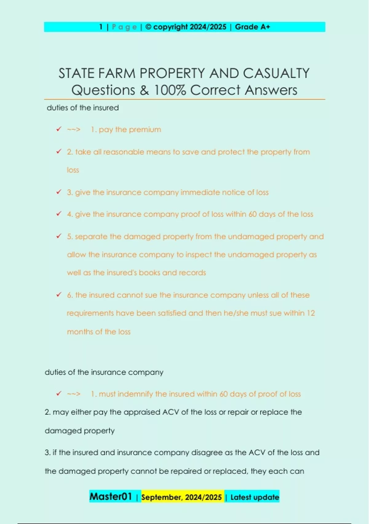 duties of the insured ~~> 1. pay the premium 2. take all reasonable means to save and protect the property from loss 3. give the insurance company immediate notice of loss 4. give the insurance company proof of loss within 60 days of the loss 5. separate the damaged property from the undamaged property and allow the insurance company to inspect the undamaged property as well as the insured's books and records 6. the insured cannot sue the insurance company unless all of these requirements have been satisfied and then he/she must sue within 12 months of the loss duties of the insurance company ~~> 1. must indemnify the insured within 60 days of proof of loss 2. may either pay the appraised ACV of the loss or repair or replace the damaged property 3. if the insured and insurance company disagree as the ACV of the loss and the damaged property cannot be repaired or replaced, they each can 2 | P a g e | © copyright 2024/2025 | Grade A+ Master01 | September, 2024/2025 | Latest update select an appraiser. if the appraisers disagree, they select an umpire appraiser who will make the final determination the subrogation clause ~~> states that the insurance company can require the insured to assign (transfer) to it any legal rights which the insured has against third parties to the insurance company at the time of loss assignment clause ~~> 1. transfer of a policy to another person 2. assignment clause of property insurance policy says no assignment of the policy is valid unless signed by an officer of the insurance company the other insurance clause ~~> states that the insurance company can either prohibit other insurance or can limit the amount of other insurance by adding an endorsement to the policy pro rata liability clause 3 | P a g e | © copyright 2024/2025 | Grade A+ Master01 | September, 2024/2025 | Latest update ~~> 1. applies when there are concurrent policies. concurrent insurance is when 2 or more policies cover the same property. it is sometimes done when insuring high value property. the policies should be identical in all respects except face amounts 2. says that no insurance company shall be responsible for any more than its pro rata share of the loss mortgagee rights ~~> -if a mortgagee (lender) is named on the declarations page, it acquires 3 rights in the policy: 1. 10 days notice of cancellation 2. to have the loss paid to the mortgagee 3. to provide proof of loss should the insured fail to