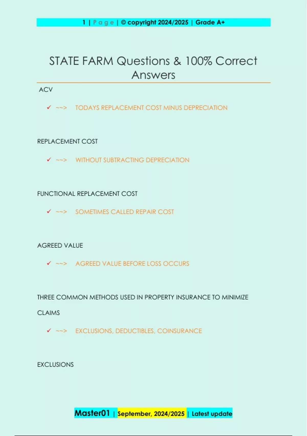 ACV ~~> TODAYS REPLACEMENT COST MINUS DEPRECIATION REPLACEMENT COST ~~> WITHOUT SUBTRACTING DEPRECIATION FUNCTIONAL REPLACEMENT COST ~~> SOMETIMES CALLED REPAIR COST AGREED VALUE ~~> AGREED VALUE BEFORE LOSS OCCURS THREE COMMON METHODS USED IN PROPERTY INSURANCE TO MINIMIZE CLAIMS ~~> EXCLUSIONS, DEDUCTIBLES, COINSURANCE EXCLUSIONS 2 | P a g e | © copyright 2024/2025 | Grade A+ Master01 | September, 2024/2025 | Latest update ~~> EVENTS AND PROPERTIES THAT ARE NOT COVERED DEDUCTIBLES ~~> RETAIN RISK. MINIMIZES THE USAGE OF THE POLICY AND HELPS ELIMINATE SMALL CLAIMS COINSURANCE ~~> REWARD POLICYOWNERS WHO BUY ADEQUATE AMOUNTS OF COVERAGE AND PUNISHING THOSE WHO DO NOT. COINSURANCE ~~> DID/SHOULD TIMES LOSS MINUS DEDUCTIBLE HOMEOWNERS ~~> WILL COVER YOUR PERSONAL PROPERTY ANYWHERE IN THE WORLD. COMMERCIAL PROPERTY ~~> COVERS BUSINESS PERSONAL PROPERTY ON PREMISES OR WITHIN 100 FEET OF PREMISES 3 | P a g e | © copyright 2024/2025 | Grade A+ Master01 | September, 2024/2025 | Latest update MORTGAGE HOLDERS ~~> THE BANK STANDARD MORTGAGE CLAUSE ~~> APPEARS IN PROPERTY POLICIES TO