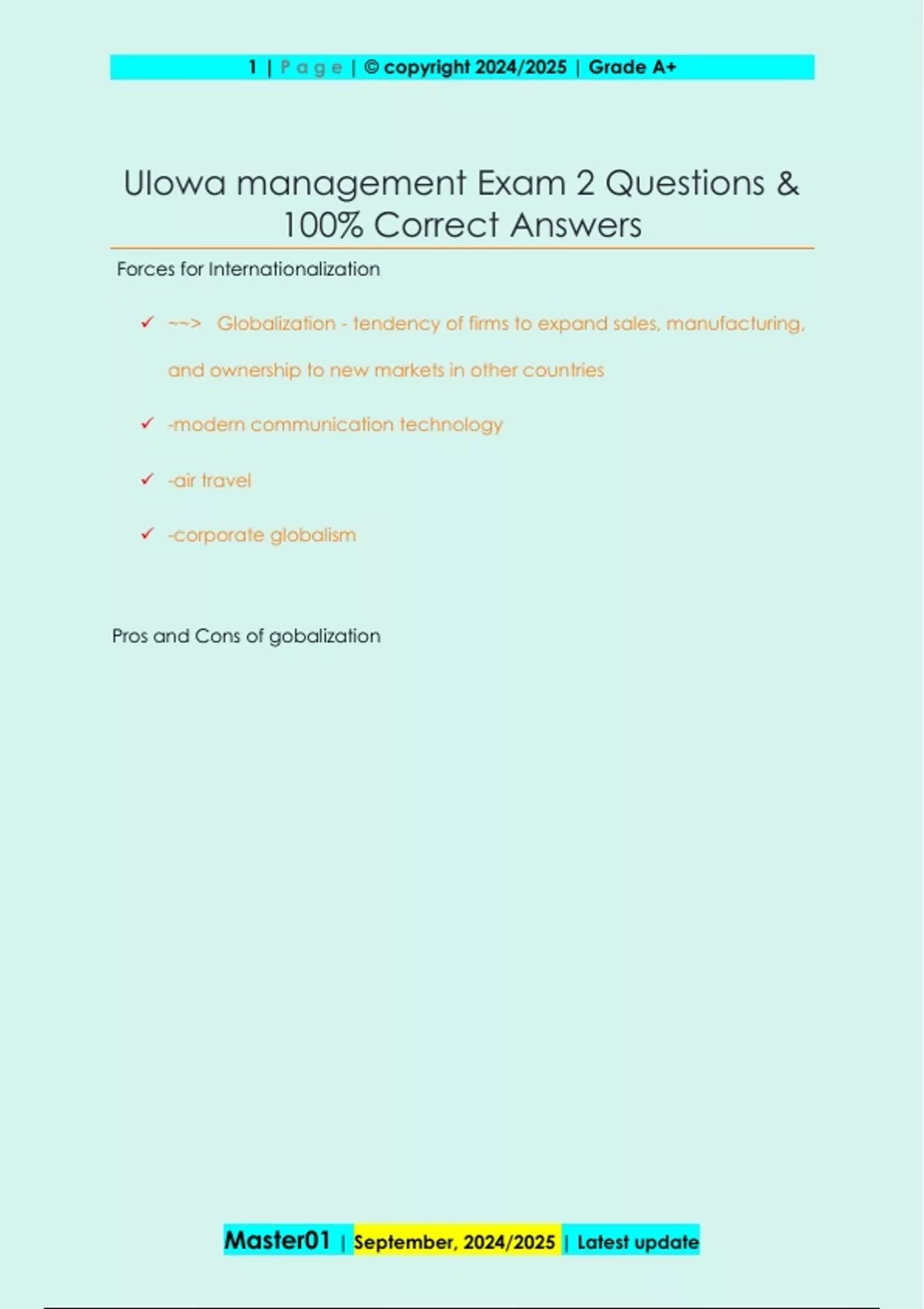 Forces for Internationalization ~~> Globalization - tendency of firms to expand sales, manufacturing, and ownership to new markets in other countries -modern communication technology -air travel -corporate globalism Pros and Cons of gobalization 2 | P a g e | © copyright 2024/2025 | Grade A+ Master01 | September, 2024/2025 | Latest update ~~> Pros: -productivity grows -living standards increase -inflation is less likely (cheap) -innovation (new ideas) -access to new markets and new customers -export jobs pay more Cons: -Americans lose jobs -fear losing jobs -competition for american companies -pay cut -service and white collar job in danger Internationalization Process - 5 big options ~~> Stage 1: Exporting - selling domestically produced products to customers in foreign countries Stage 2: Cooperative contracts - an agreement in which a foreign business owner pays a company a fee for the right to conduct that business in his or her country 3 | P a g e | © copyright 2024/2025 | Grade A+ Master01 | September, 2024/2025 | Latest update Stage 3: Strategic alliances - an agreement in which companies combine key resources, costs, risks, technology, and people Stage 4: Wholly owned affiliates - foreign offices, facilities, and manufacturing plants that are 100% owned by the parent company New Global Ventures - new companies that are founded with an active global strategy and have sales, employees, and financing in different countries 2 types of cooperative contracts ~~> Licensing - an agreement in which a domestic company, the licencor, receives royalty payments for allowing another company, the licensee to produce the licencor's product, sell its service, or use its brand name in a specified foreign market Franchising - a collection of networked firms in which the manufacturer or marketer of a product or service, the franchiser, licenses the entire business to another person or organization, the franchise