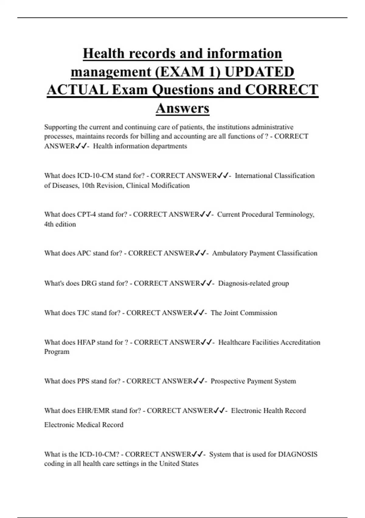Health records and information management (EXAM 1) UPDATED ACTUAL Exam Questions and CORRECT Answers Supporting the current and continuing care of patients, the institutions administrative processes, maintains records for billing and accounting are all functions of ? - CORRECT ANSWER- Health information departments What does ICD-10-CM stand for? - CORRECT ANSWER- International Classification of Diseases, 10th Revision, Clinical Modification