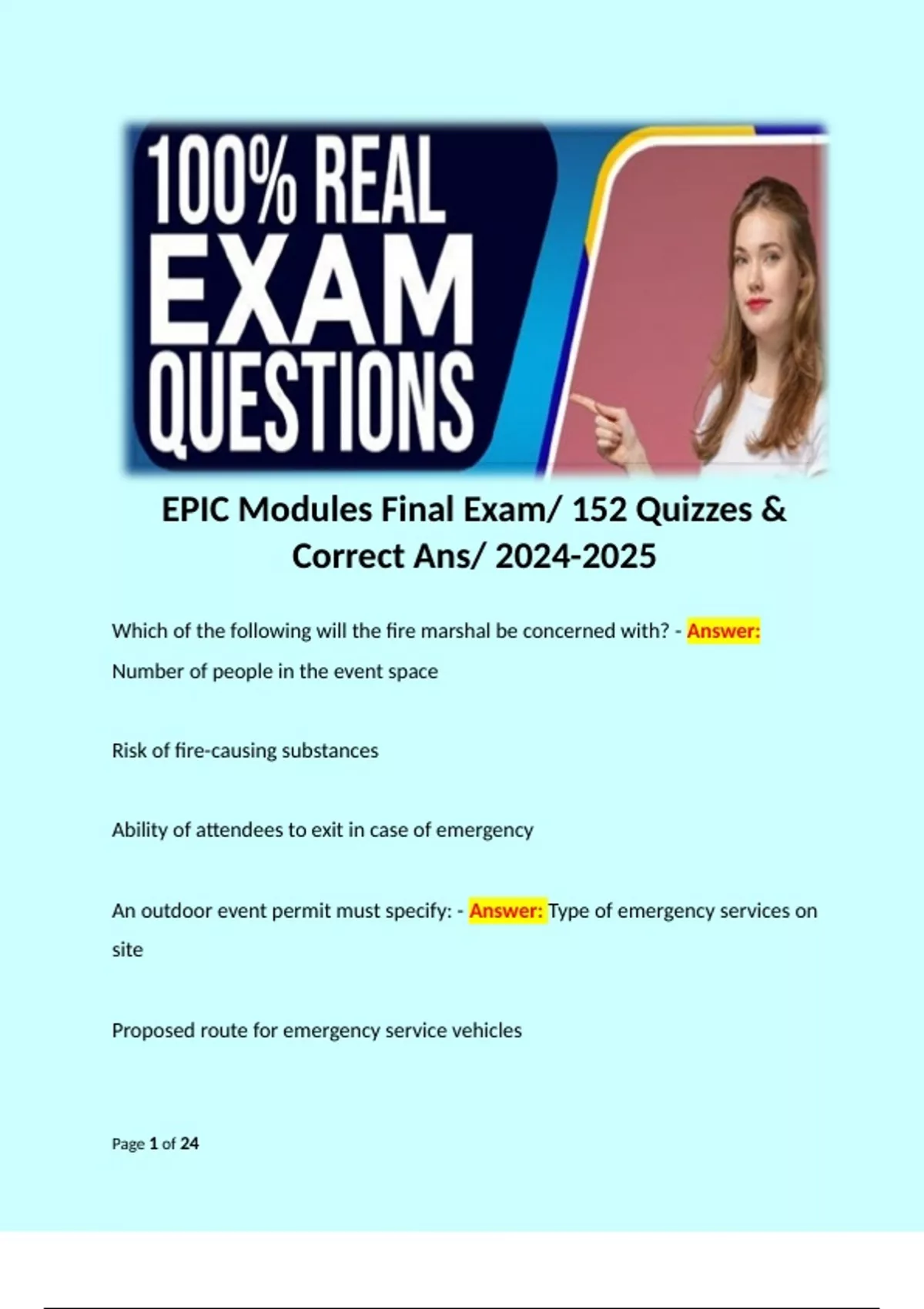 EPIC Modules Final Exam/ 152 Quizzes & Correct Ans/ Which of the following will the fire marshal be concerned with? - Answer: Number of people in the event space Risk of fire-causing substances Ability of attendees to exit in case of emergency