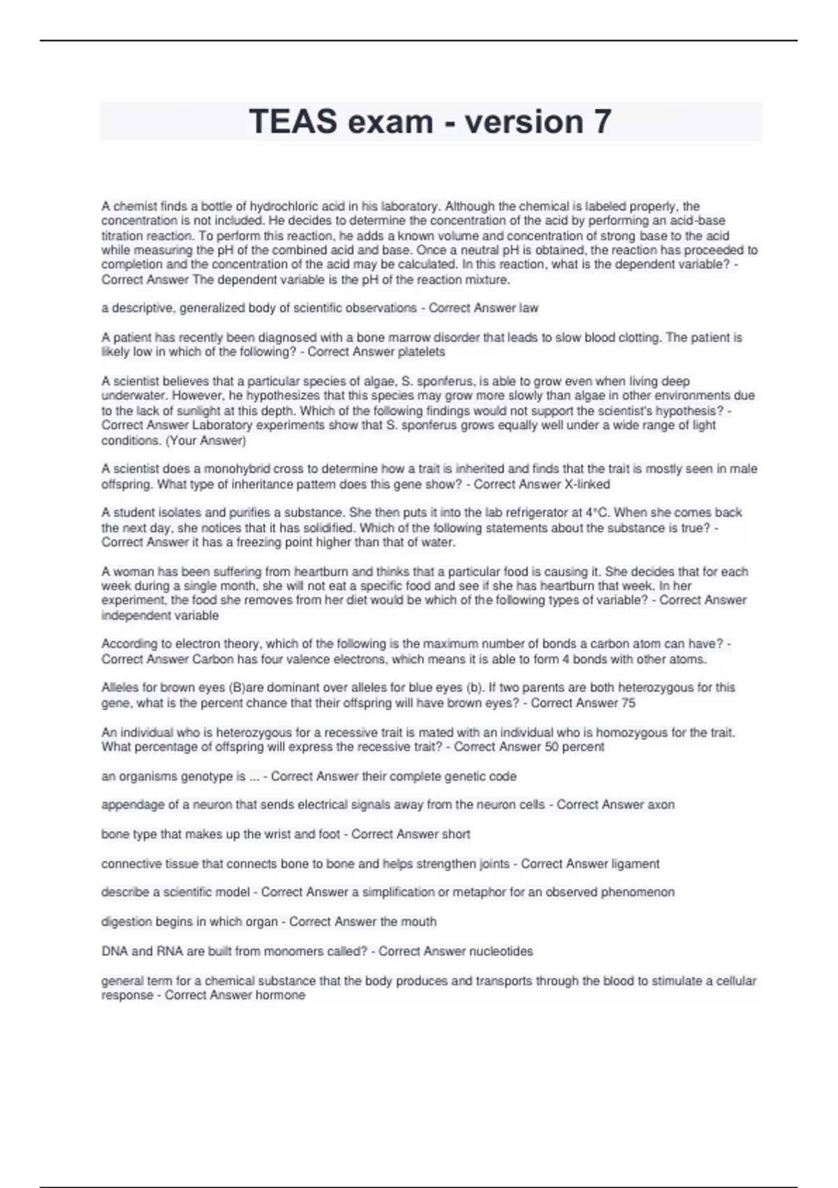 A chemist finds a bottle of hydrochloric acid in his laboratory. Although the chemical is labeled properly, the concentration is not included. He decides to determine the concentration of the acid by performing an acid-base titration reaction. To perform this reaction, he adds a known volume and concentration of strong base to the acid while measuring the pH of the combined acid and base. Once a neutral pH is obtained, the reaction has proceeded to completion and the concentration of the acid may be calculated. In this reaction, what is the dependent variable? - Correct Answer The dependent variable is the pH of the reaction mixture. a descriptive, generalized body of scientific observations - Correct Answer law A patient has recently been diagnosed with a bone marrow disorder that leads to slow blood clotting. The patient is likely low in which of the following? - Correct Answer platelets A scientist believes that a particular species of algae, S. sponferus, is able to grow even when living deep underwater. However, he hypothesizes that this species may grow more slowly than algae in other environments due to the lack of sunlight at this depth. Which of the following findings would not support the scientist's hypothesis? - Correct Answer Laboratory experiments show that S. sponferus grows equally well under a wide range of light conditions. (Your Answer) A scientist does a monohybrid cross to determine how a trait is inherited and finds that the trait is mostly seen in male offspring. What type of inheritance pattern does this gene show? - Correct Answer X-linked A student isolates and purifies a substance. She then puts it into the lab refrigerator at 4°C. When she comes back the next day, she notices that it has solidified. Which of the following statements about the substance is true? - Correct Answer it has a freezing point higher than that of water. A woman has been suffering from heartburn and thinks that a particular food is causing it. She decides that for each week during a single month, she will not eat a specific food and see if she has heartburn that week. In her experiment, the food she removes from her diet would be which of the following types of variable? - Correct Answer independent variable According to electron theory, which of the following is the maximum number of bonds a carbon atom can have? - Correct Answer Carbon has four valence electrons, which means it is able to form 4 bonds with other atoms. Alleles for brown eyes (B)are dominant over alleles for blue eyes (b). If two parents are both heterozygous for this gene, what is the percent chance that their offspring will have brown eyes? - Correct Answer 75 An individual who is heterozygous for a recessive trait is mated with an individual who is homozygous for the trait. What percentage of offspring will express the recessive trait? - Correct Answer 50 percent an organisms genotype is ... - Correct Answer their complete genetic code appendage of a neuron that sends electrical signals away from the neuron cells - Correct Answer axon bone type that makes up the wrist and foot - Correct Answer short connective tissue that connects bone to bone and helps strengthen joints - Correct Answer ligament describe a scientific model - Correct Answer a simplification or metaphor for an observed phenomenon digestion begins in which organ - Correct Answer the mouth DNA and RNA are built from monomers called? - Correct Answer nucleotides general term for a chemical substance that the body produces and transports through the blood to stimulate