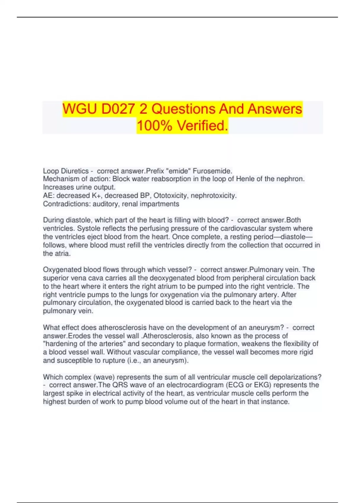 WGU D027 2 Questions And Answers 100% Verified. Loop Diuretics - correct answer.Prefix "emide" Furosemide. Mechanism of action: Block water reabsorption in the loop of Henle of the nephron. Increases urine output. AE: decreased K+, decreased BP, Ototoxicity, nephrotoxicity. Contradictions: auditory, renal impartments During diastole, which part of the heart is filling with blood? - correct answer.Both ventricles. Systole reflects the perfusing pressure of the cardiovascular system where the ventricles eject blood from the heart. Once complete, a resting period—diastole—follows, where blood must refill the ventricles directly from the collection that occurred in the atria. Oxygenated blood flows through which vessel? - correct answer.Pulmonary vein. The superior vena cava carries all the deoxygenated blood from peripheral circulation back to the heart where it enters the right atrium to be pumped into the right ventricle. The right ventricle pumps to the lungs for oxygenation via the pulmonary artery. After pulmonary circulation, the oxygenated blood is carried back to the heart via the pulmonary vein. What effect does atherosclerosis have on the development of an aneurysm? - correct answer.Erodes the vessel wall .Atherosclerosis, also known as the process of "hardening of the arteries" and secondary to plaque formation, weakens the flexibility of a blood vessel wall. Without vascular compliance, the vessel wall becomes more rigid and susceptible to rupture (i.e., an aneurysm). Which complex (wave) represents the sum of all ventricular muscle cell depolarizations? - correct answer.The QRS wave of an electrocardiogram (ECG or EKG) represents the largest spike in electrical activity of the heart, as ventricular muscle cells perform the highest burden of work to pump blood volume out of the heart in that instance. Which factor is responsible for the hypertrophy of the myocardium associated with hypertension? - correct answer.Angiotensin II leads to myocardial hypertrophy, poor myocardial compliance, and ventricular dilation through stimulating increased cardiac preload and afterload and direct toxicity to myocardial cells. It causes sarcomere death, abnormal collagen matrices, and interstitial fibrosis Most cardiovascular developments occur between which weeks of gestation? - correct answer.During weeks four to seven, the primitive heart tube progresses through numerous stages of development leading to a developed heart with distinct atria, ventricles, and cardiac vessels. Which compensatory mechanism is spontaneously used by children diagnosed with tetralogy of Fallot (TOF) to relieve hypoxic spells? - correct answer.Spontaneous squatting helps relieve hypercyanotic events in older children through increasing systemic vascular resistance, decreasing venous blood return. This provides a larger amount of oxygenated blood for the body and leads to the temporary reversal of blood through the ventricular septal defect (VSD), which results in increased pulmonary flow. Squatting is rarely seen clinically because most TOF defects are diagnosed and surgically repaired in infancy Which condition is consistent with the cardiac defect of transposition of the great vessels? - correct answer.The aorta arises from the right ventricle. In transposition of the great vessels, opposite of a normal heart, the aorta arises from the right ventricle, and the pulmonary artery arises from the left ventricle. A 26-year-old female presents to urgent care with complaints of extreme fatigue, muscle aches, abdominal pain, numbness and tingling in her extremities, and bloating. She explains that she has been experiencing gastrointestinal upset after meals and has not had a bowel movement for the past four days. She reports using over-the-counter, anti-diarrheal products last week to combat diarrhea. She denies having any chronic diseases. The assessment findings include a blood pressure of 108/71 mm Hg, pulse of 82 beats per minute, and respirations of 20 breaths per minute. The abdomen is distended and firm. Bowel sounds are present in all four quadrants. The patient has a steady gait, though verbally complains of feeling weak and off balance upon ambulation. Following antibody testing, Celiac disease is suspected. Which follow-up tissue test, the gold standard for this suspected diagnosis, should be ordered? - correct answer.Endoscopy with small intestine biopsy A 44-year-old woman has recently been diagnosed with advanced metastatic non-small-cell lung cancer. Genetic testing is ordered to determine if the patient's tumor has any genomic alterations and to guide treatment decisions. A few weeks later, the patient's test results come back positive for a genetic mutation. The APN starts osimertinib (Tagrisso).Based on this information, what type of genetic mutation does this patient have? - correct answer.EGFR mutation A 20-year-old male meets with an advanced professional nurse (APN) to discuss symptoms that have been slowly progressing over the past several years. He is mainly concerned because he has been falling frequently. Since childhood, his gait has consisted of walking on his toes. During middle school, he was able to participate in sports but was unable to participate in high school sports due to difficulty with running and jumping. Lately, he has noticed it takes longer and is more difficult to change positions from sitting to standing than it used to in the past. He has also been waking up with muscle and joint stiffness. The APRN notes that his family history is not significant for any chronic or genetic diseases. Which condition is likely to be the cause of these symptoms? - correct answer.Becker muscular dystrophy. Mutation of gene dystrophin. X-linked. Affects muscles of hips, pelvic area, thighs, and shoulders, as well as the heart. Diagnostic CK levels 5x normal. Which statement should the provider give the patient regarding the pathophysiology of SLE and its relation to thrombocytopenia? - correct