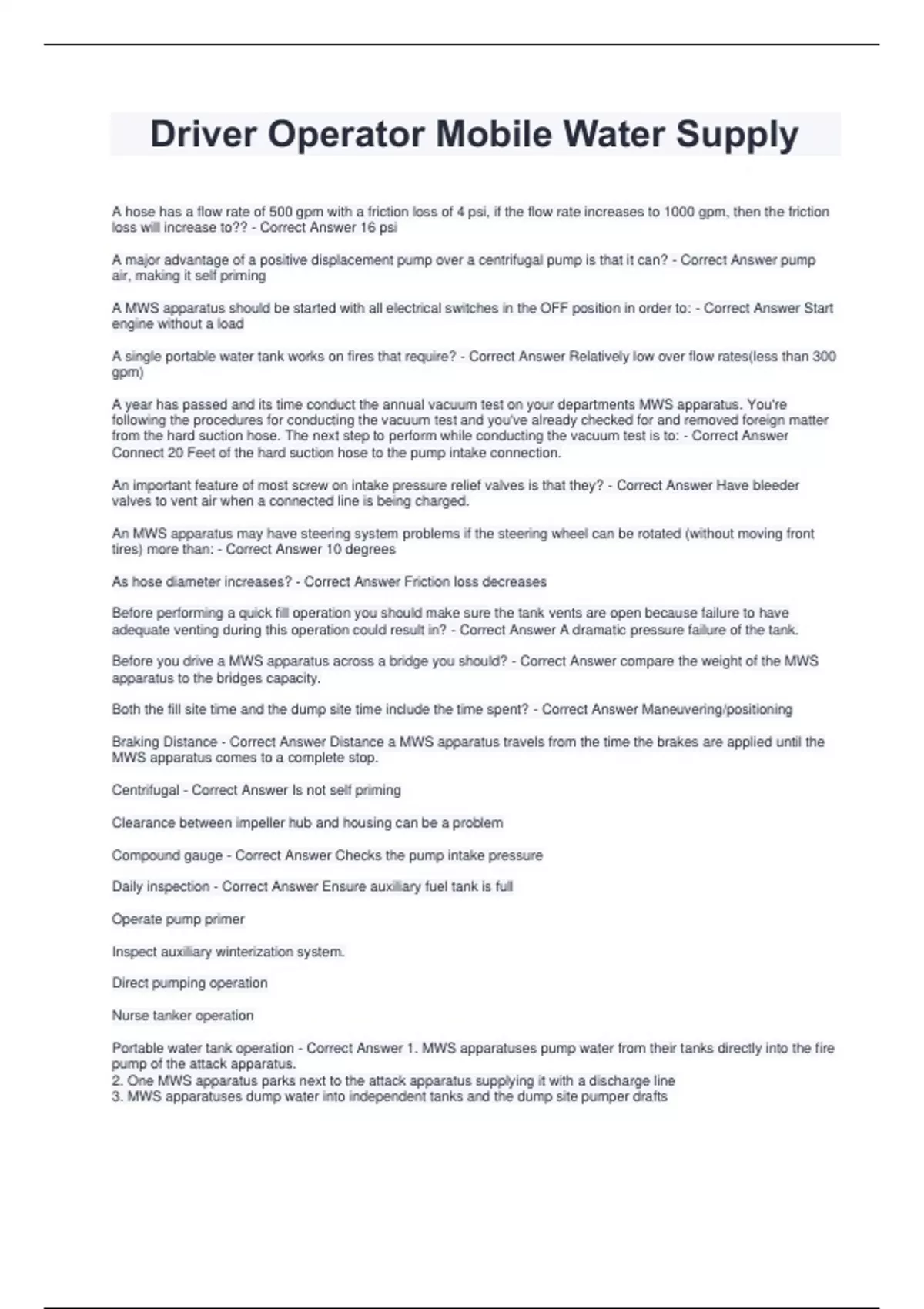 A hose has a flow rate of 500 gpm with a friction loss of 4 psi, if the flow rate increases to 1000 gpm, then the friction loss will increase to?? - Correct Answer 16 psi A major advantage of a positive displacement pump over a centrifugal pump is that it can? - Correct Answer pump air, making it self priming A MWS apparatus should be started with all electrical switches in the OFF position in order to: - Correct Answer Start engine without a load A single portable water tank works on fires that require? - Correct Answer Relatively low over flow rates(less than 300 gpm) A year has passed and its time conduct the annual vacuum test on your departments MWS apparatus. You're following the procedures for conducting the vacuum test and you've already checked for and removed foreign matter from the hard suction hose. The next step to perform while conducting the vacuum test is to: - Correct Answer Connect 20 Feet of the hard suction hose to the pump intake connection. An important feature of most screw on intake pressure relief valves is that they? - Correct Answer Have bleeder valves to vent air when a connected line is being charged. An MWS apparatus may have steering system problems if the steering wheel can be rotated (without moving front tires) more than: - Correct Answer 10 degrees As hose diameter increases? - Correct Answer Friction loss decreases Before performing a quick fill operation you should make sure the tank vents are open because failure to have adequate venting during this operation could result in? - Correct Answer A dramatic pressure failure of the tank. Before you drive a MWS apparatus across a bridge you should? - Correct Answer compare the weight of the MWS apparatus to the bridges capacity. Both the fill site time and the dump site time include the time spent? - Correct Answer Maneuvering/positioning Braking Distance - Correct Answer Distance a MWS apparatus travels from the time the brakes are applied until the MWS apparatus comes to a complete stop. Centrifugal - Correct Answer Is not self priming Clearance between impeller hub and housing can be a problem Compound gauge - Correct Answer Checks the pump intake pressure Daily inspection - Correct Answer Ensure auxiliary fuel tank is full Operate pump primer Inspect auxiliary winterization system. Direct pumping operation Nurse tanker operation Portable water tank operation - Correct Answer 1. MWS apparatuses pump water from their tanks directly into the fire