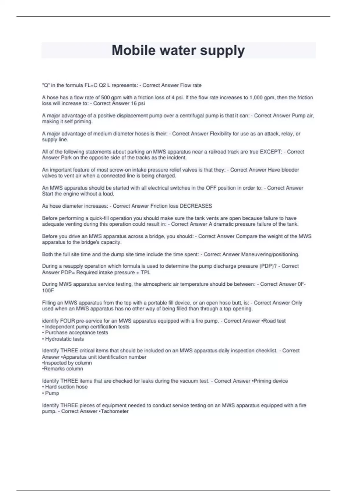 "Q" in the formula FL=C Q2 L represents: - Correct Answer Flow rate A hose has a flow rate of 500 gpm with a friction loss of 4 psi. If the flow rate increases to 1,000 gpm, then the friction loss will increase to: - Correct Answer 16 psi A major advantage of a positive displacement pump over a centrifugal pump is that it can: - Correct Answer Pump air, making it self priming. A major advantage of medium diameter hoses is their: - Correct Answer Flexibility for use as an attack, relay, or supply line. All of the following statements about parking an MWS apparatus near a railroad track are true EXCEPT: - Correct Answer Park on the opposite side of the tracks as the incident. An important feature of most screw-on intake pressure relief valves is that they: - Correct Answer Have bleeder valves to vent air when a connected line is being charged. An MWS apparatus should be started with all electrical switches in the OFF position in order to: - Correct Answer Start the engine without a load. As hose diameter increases: - Correct Answer Friction loss DECREASES Before performing a quick-fill operation you should make sure the tank vents are open because failure to have adequate venting during this operation could result in: - Correct Answer A dramatic pressure failure of the tank. Before you drive an MWS apparatus across a bridge, you should: - Correct Answer Compare the weight of the MWS apparatus to the bridge's capacity. Both the full site time and the dump site time include the time spent: - Correct Answer Maneuvering/positioning. During a resupply operation which formula is used to determine the pump discharge pressure (PDP)? - Correct Answer PDP= Required intake pressure + TPL During MWS apparatus service testing, the atmospheric air temperature should be between: - Correct Answer 0F 100F Filling an MWS apparatus from the top with a portable fill device, or an open hose butt, is: - Correct Answer Only used when an MWS apparatus has no other way of being filled than through a top opening. identify FOUR pre-service for an MWS apparatus equipped with a fire pump. - Correct Answer •Road test • Independent pump certification tests • Purchase acceptance tests • Hydrostatic tests Identify THREE critical items that should be included on an MWS apparatus daily inspection checklist. - Correct Answer •Apparatus unit identification number •Inspected by column •Remarks column Identify THREE items that are checked for leaks during the vacuum test. - Correct Answer •Priming device • Hard suction hose • Pump Identify THREE pieces of equipment needed to conduct service testing on an M