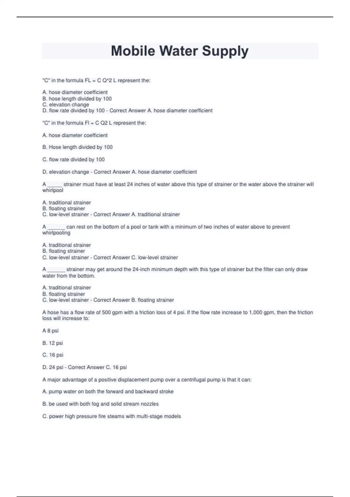"C" in the formula FL = C Q^2 L represent the: A. hose diameter coefficient B. hose length divided by 100 C. elevation change D. flow rate divided by 100 - Correct Answer A. hose diameter coefficient "C" in the formula Fl = C Q2 L represent the: A. hose diameter coefficient B. Hose length divided by 100 C. flow rate divided by 100 D. elevation change - Correct Answer A. hose diameter coefficient A _____ strainer must have at least 24 inches of water above this type of strainer or the water above the strainer will whirlpool A. traditional strainer B. floating strainer C. low-level strainer - Correct Answer A. traditional strainer A ______ can rest on the bottom of a pool or tank with a minimum of two inches of water above to prevent whirlpooling A. traditional strainer B. floating strainer C. low-level strainer - Correct Answer C. low-level strainer A ______ strainer may get around the 24-inch minimum depth with this type of strainer but the filter can only draw water from the bottom. A. traditional strainer B. floating strainer C. low-level strainer - Correct Answer B. floating strainer A hose has a flow rate of 500 gpm with a friction loss of 4 psi. If the flow rate increase to 1,000 gpm, then the friction loss will increase to: A 8 psi B. 12 psi C. 16 psi D. 24 psi - Correct Answer C. 16 psi A major advantage of a positive displacement pump over a centrifugal pump is that it can: A. pump water on both the forward and backward stroke B. be used with both fog and solid stream n