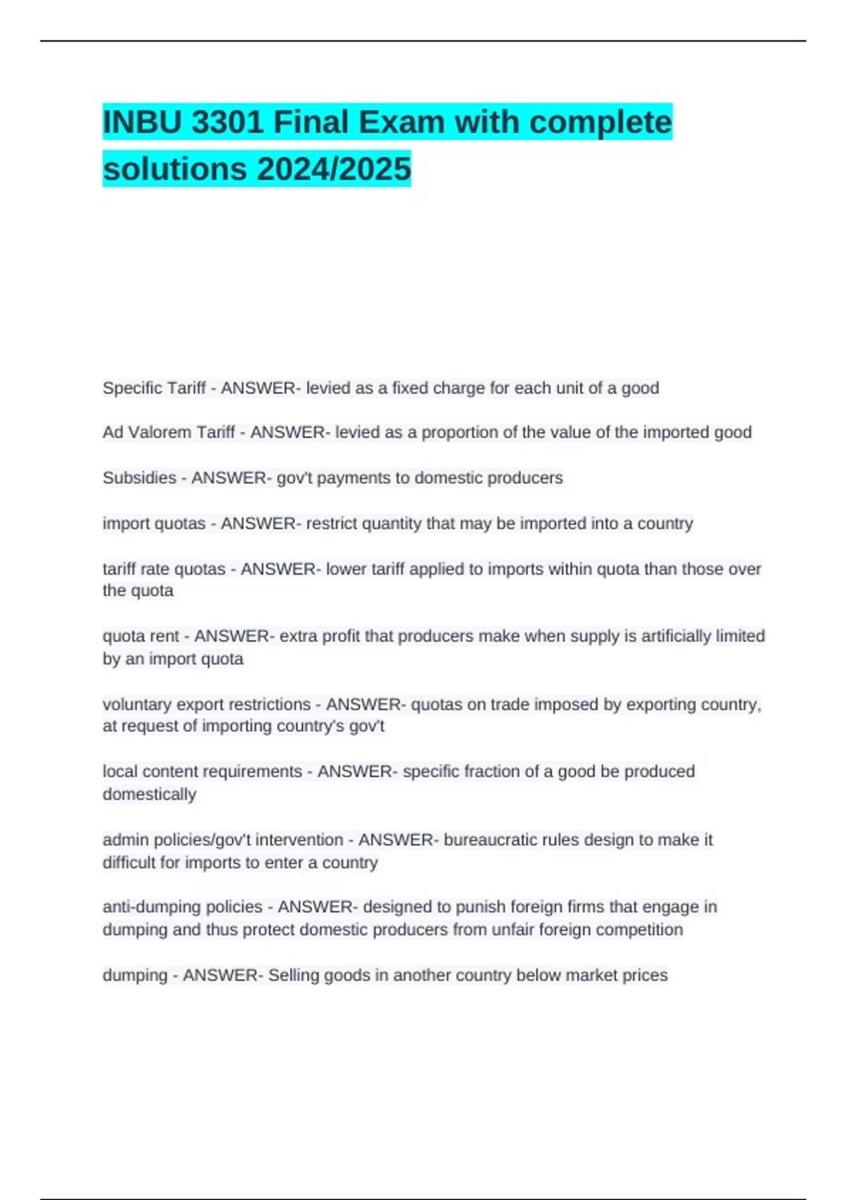 INBU 3301 Final Exam with complete solutions 2024_2025