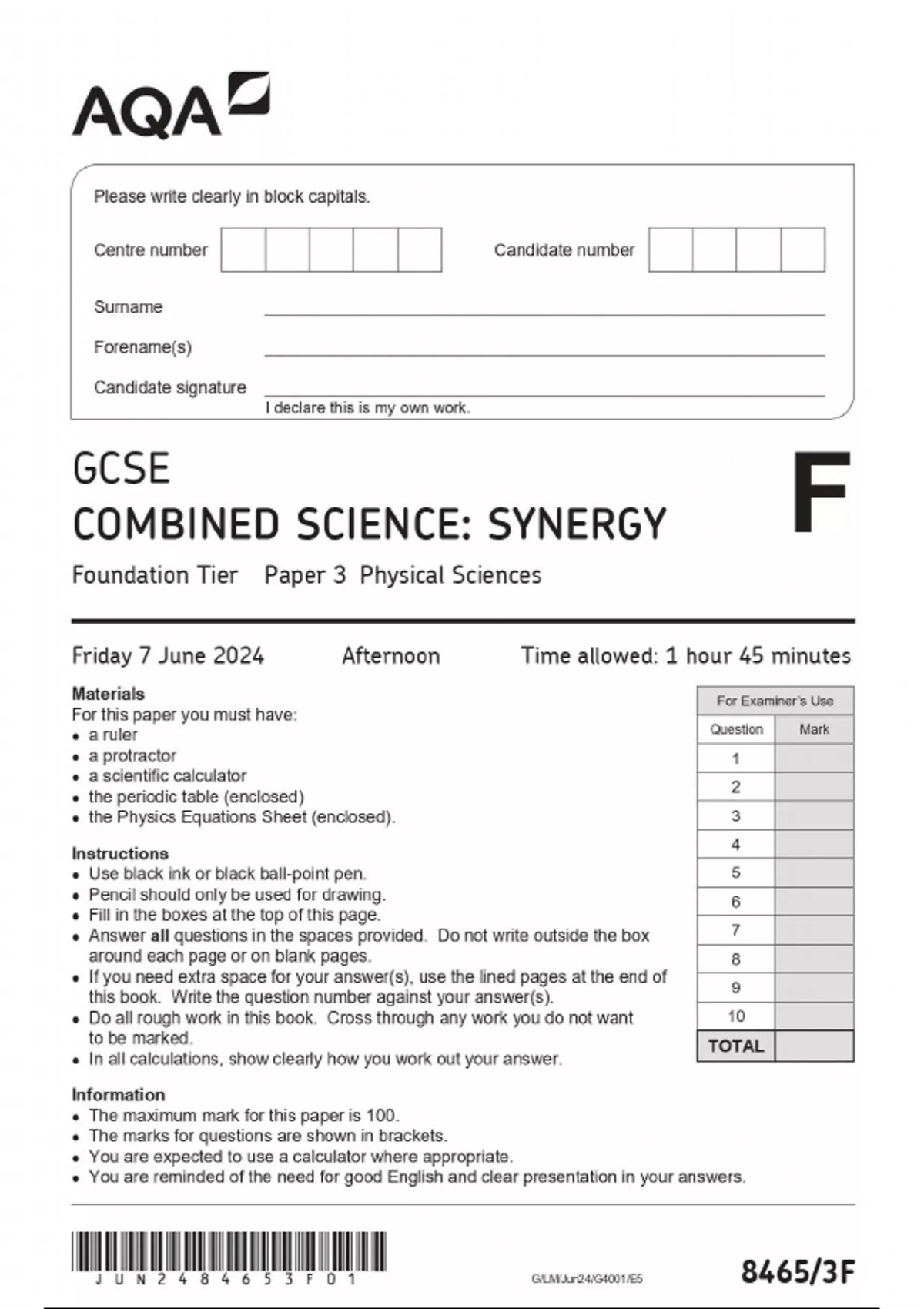 AQA GCSE COMBINED SCIENCE: SYNERGY Foundation Tier Paper 3 Physical Sciences Friday 7 June 2024
