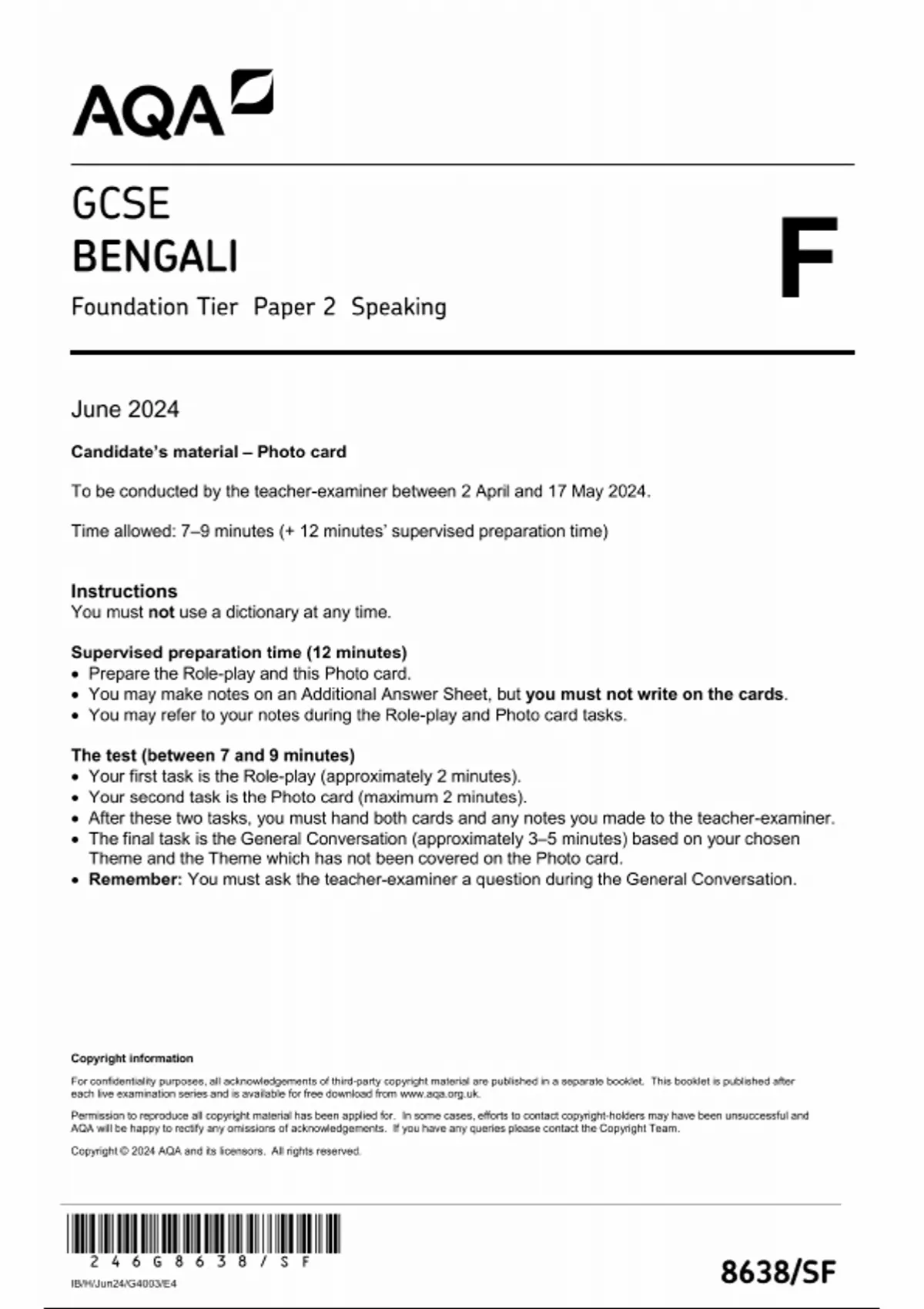 AQA GCSE BENGALI PAPER 2 FOUNDATION TIER 2024 (8638/SF: Speaking)