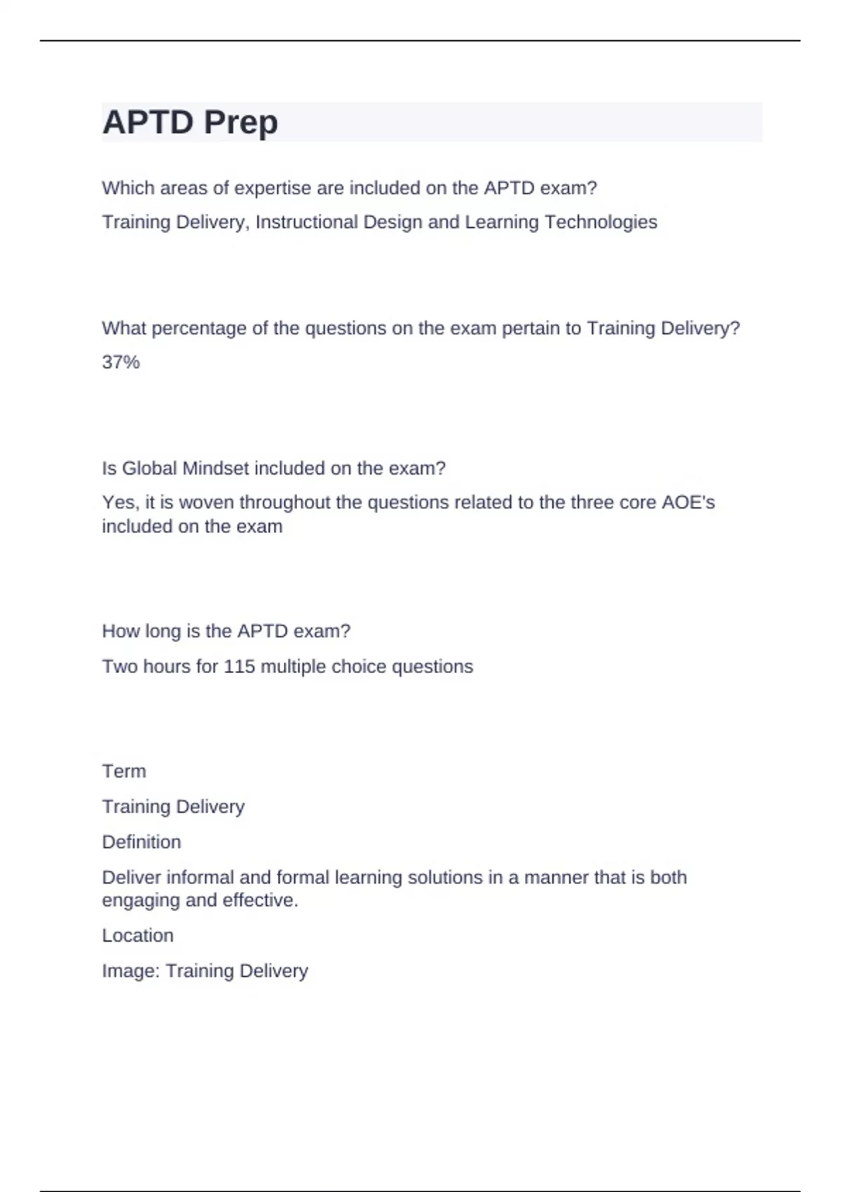 APTD Prep Question and answers 100% correct 2024/2025 Question and answers correct 2024/2025 APTD Prep Which areas of expertise are included on the APTD exam? Training Delivery, Instructional Design and Learning Technologies What percentage of the questions on the exam pertain to Training Delivery? 37% Is Global Mindset included on the exam? Yes, it is woven throughout the questions related to the three core AOE's included on the exam How long is the APTD exam? Two hours for 115 multiple choice questions