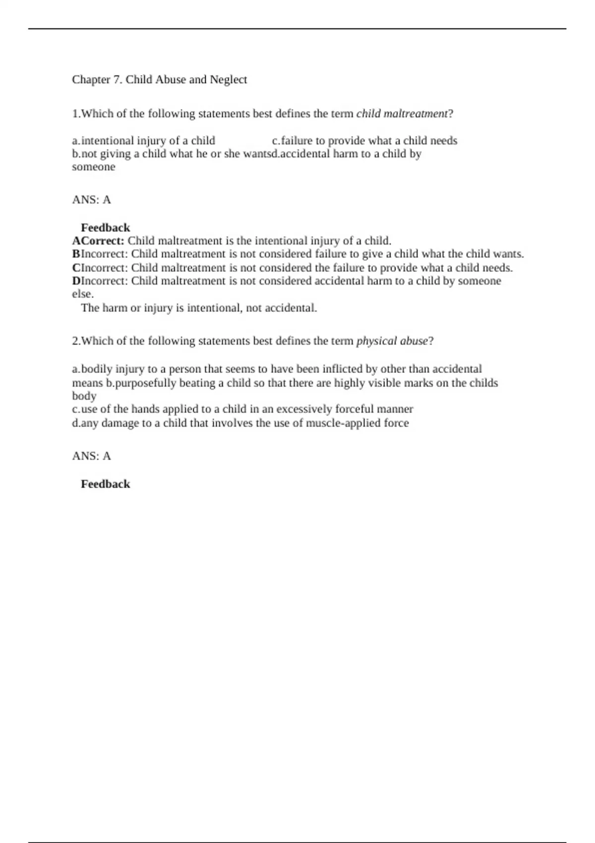 1.Which of the following statements best defines the term child maltreatment?