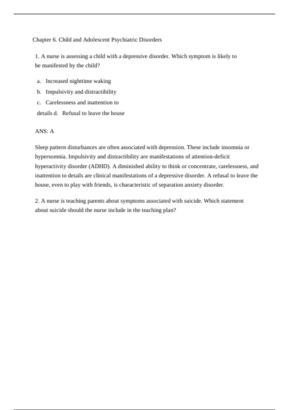 1. A nurse is assessing a child with a depressive disorder. Which symptom is likely to
