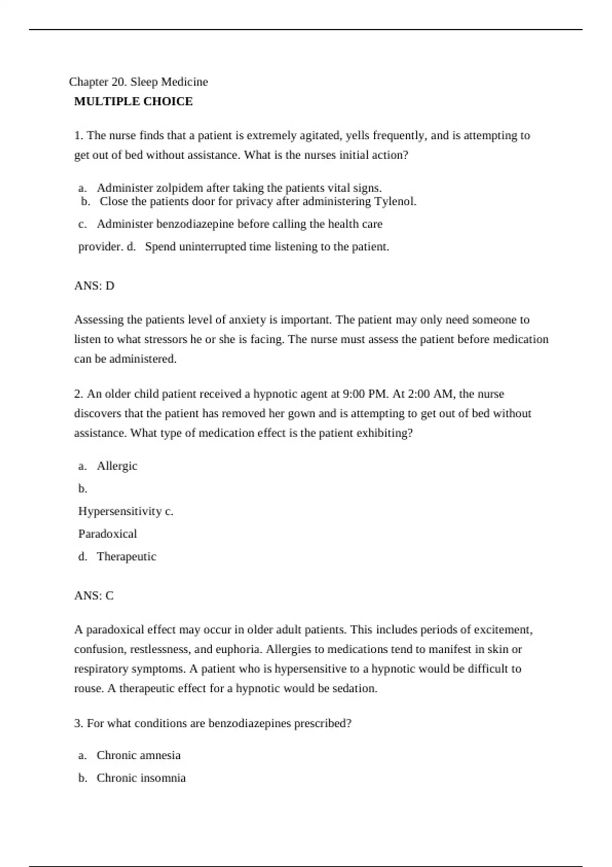 2. An older child patient received a hypnotic agent at 9:00 PM. At 2:00 AM, the nurse