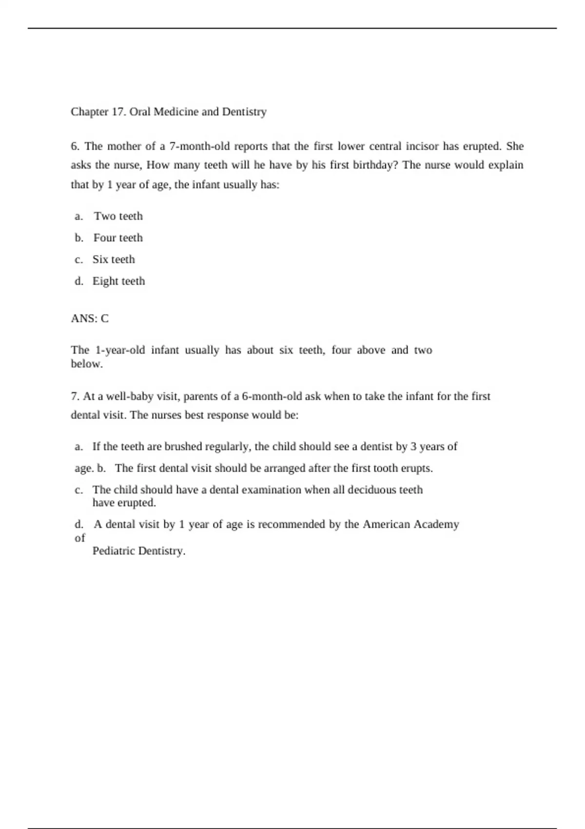 6. The mother of a 7-month-old reports that the first lower central incisor has erupted. She