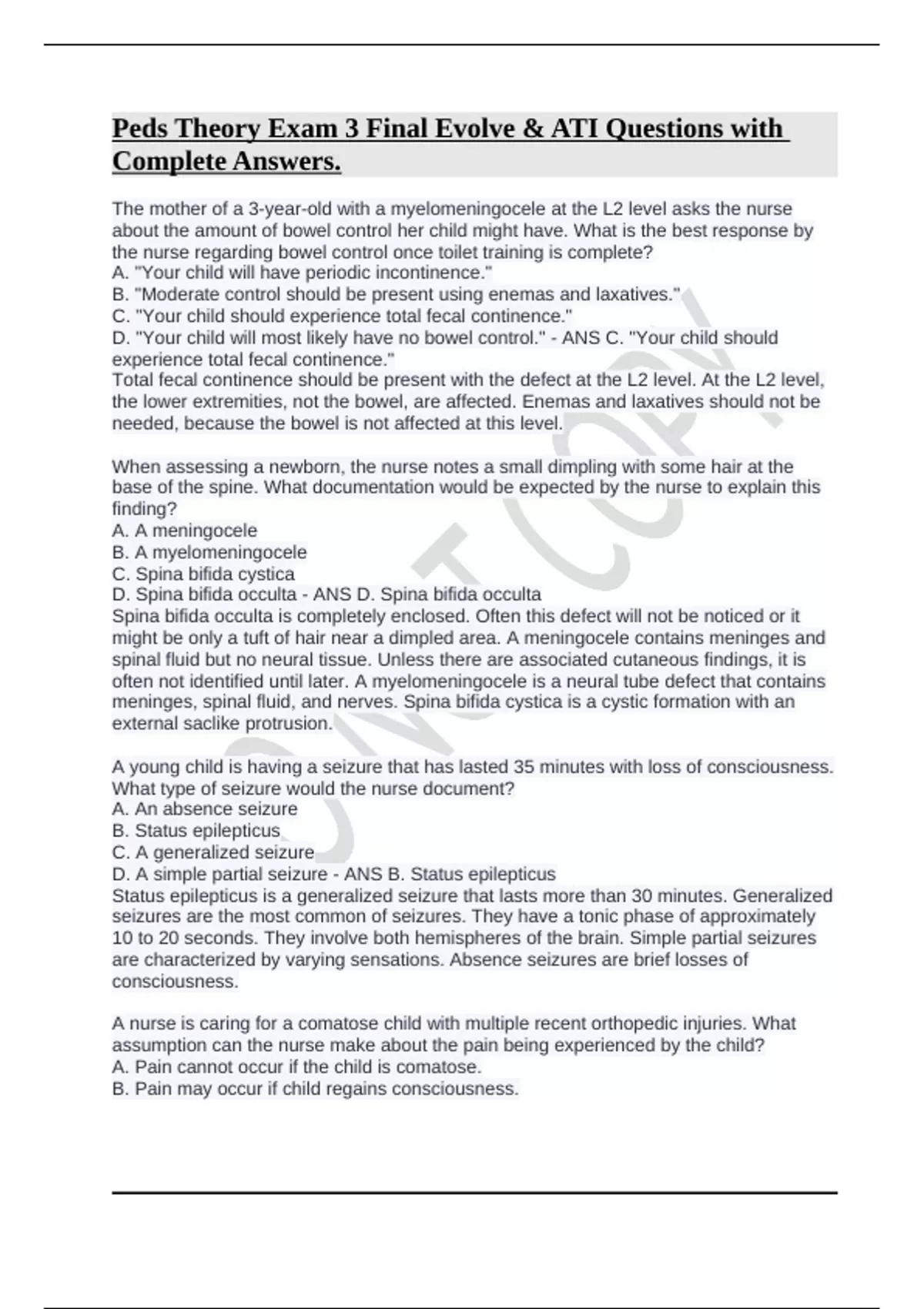 Peds Theory Exam 3 Final Evolve & ATI Questions with Complete Answers.Peds Theory Exam 3 Final Evolve & ATI Questions with Complete Answers.