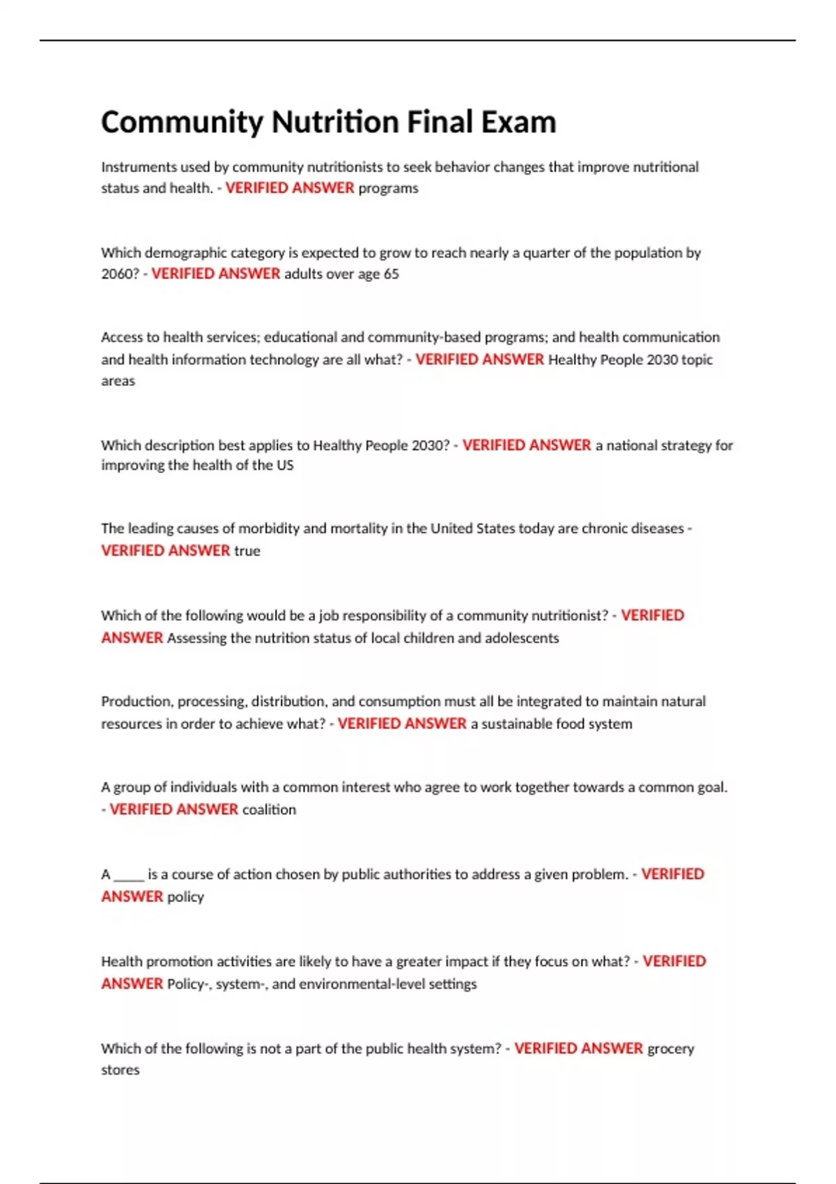 Community Nutrition Final Exam 2025. Questions And Verified Answers