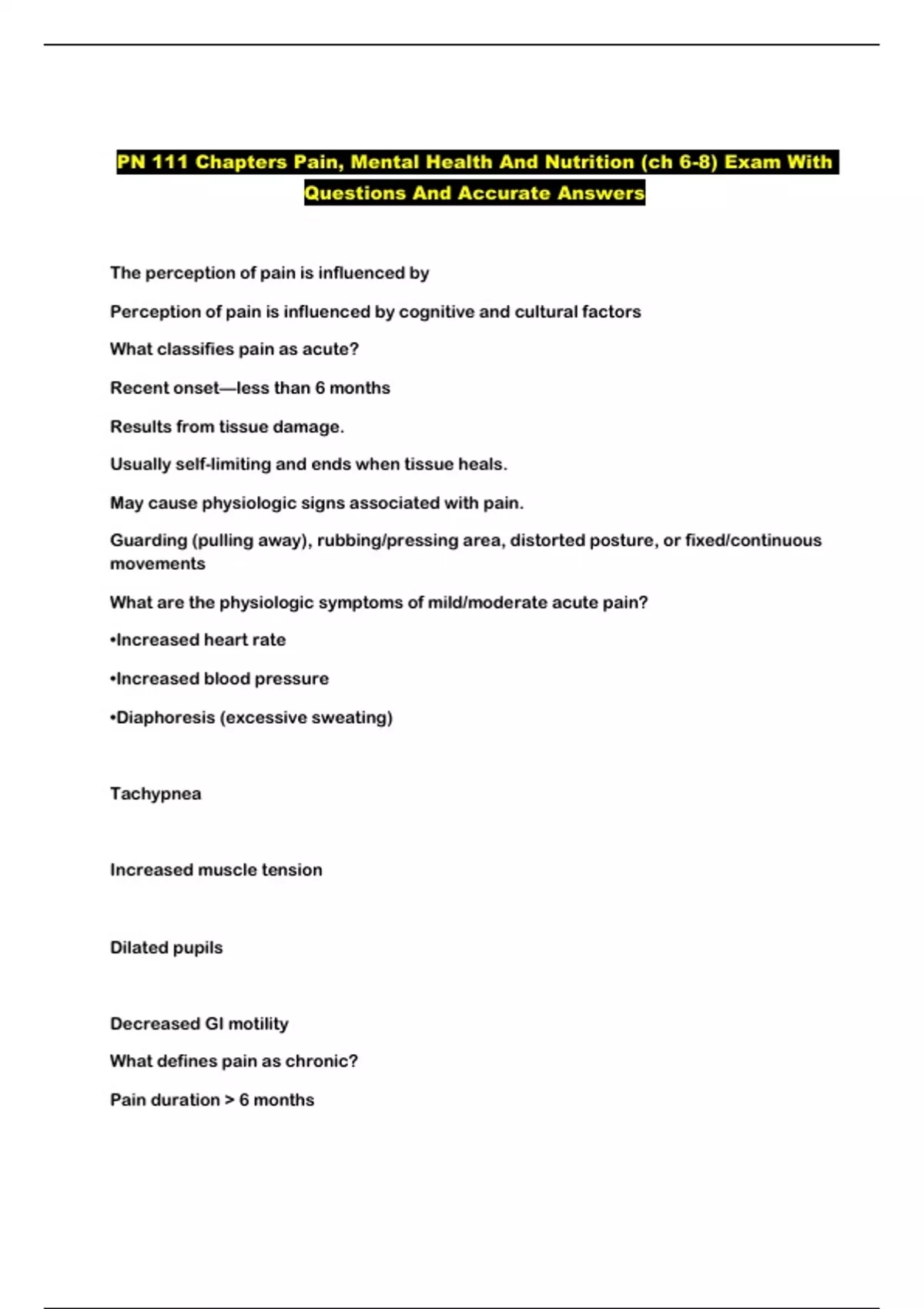 PN 111 Chapters Pain, Mental Health And Nutrition (ch 6-8) Exam With Questions And Accurate Answers...
