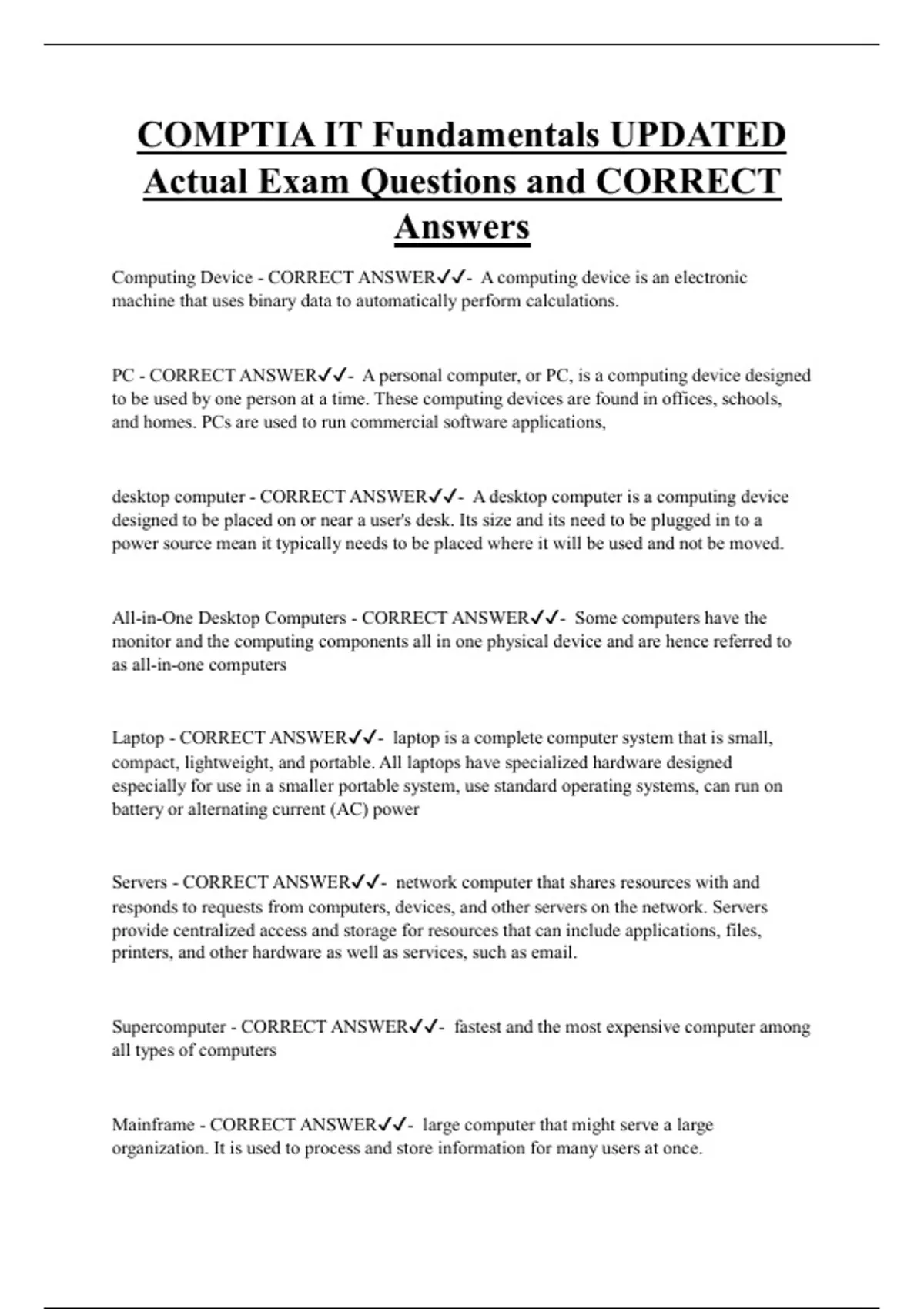 COMPTIA IT Fundamentals UPDATED Actual Exam Questions and CORRECT Answers Computing Device - CORRECT ANSWER- A computing device is an electronic machine that uses binary data to automatically perform calculations. PC - CORRECT ANSWER- A personal computer, or PC, is a computing device designed to be used by one person at a time. These computing devices are found in offices, schools, and homes. PCs are used to run commercial software applications,