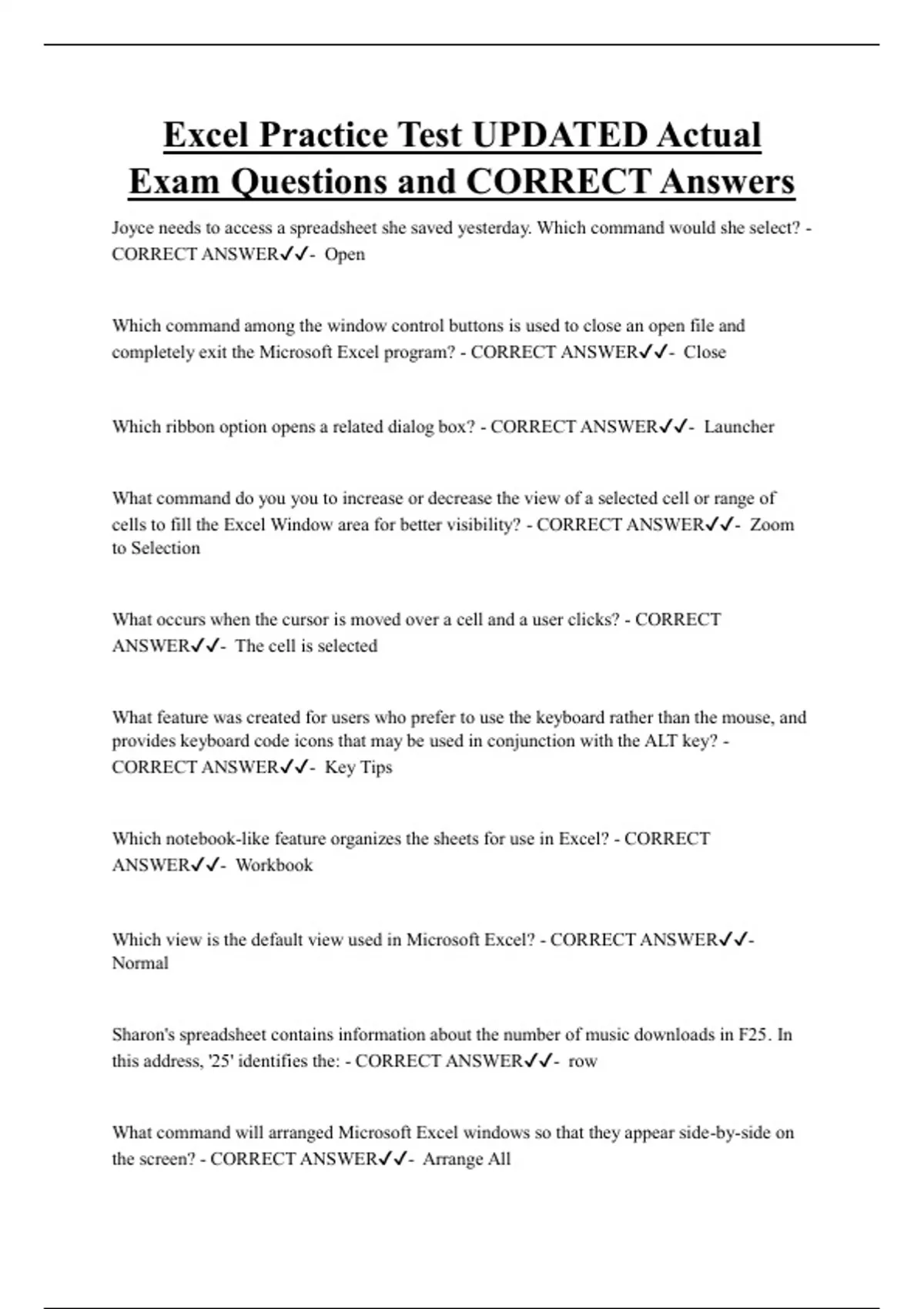 Excel Practice Test UPDATED Actual Exam Questions and CORRECT Answers Joyce needs to access a spreadsheet she saved yesterday. Which command would she select? - CORRECT ANSWER- Open Which command among the window control buttons is used to close an open file and completely exit the Microsoft Excel program? - CORRECT ANSWER- Close
