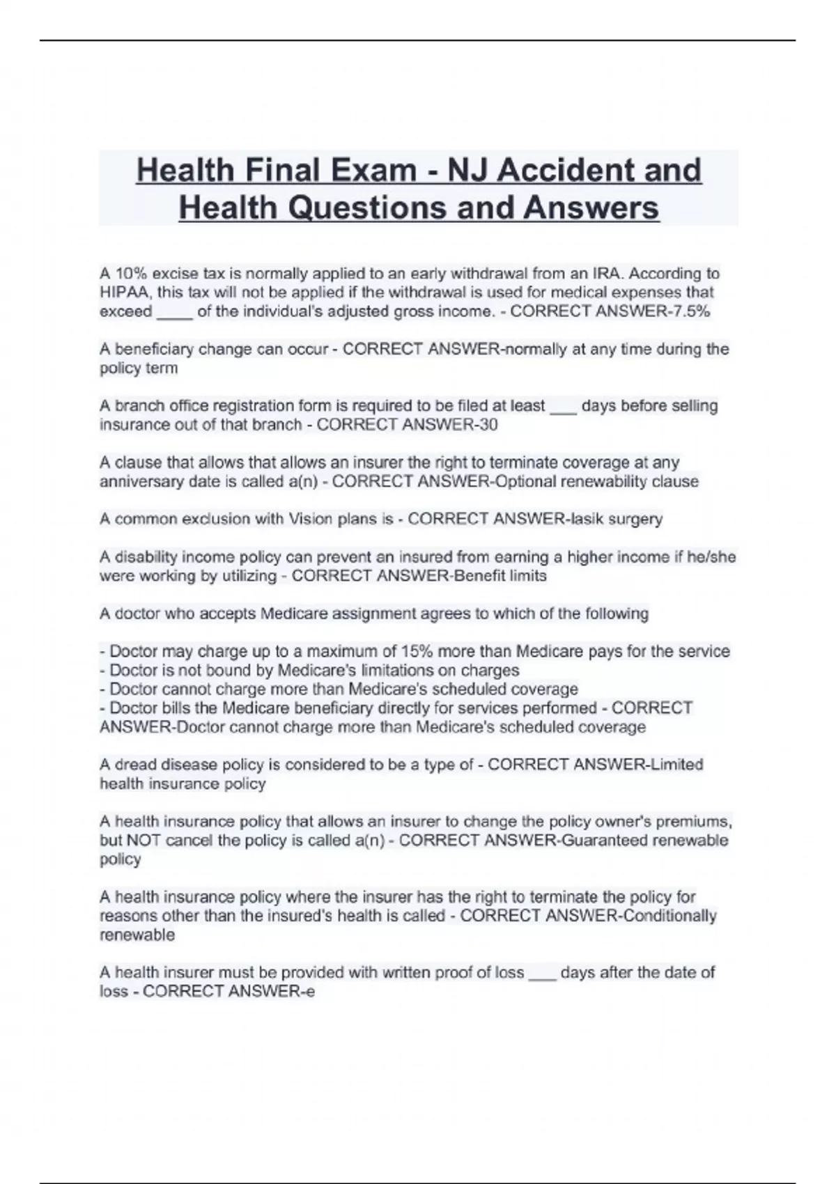 Health Final Exam - NJ Accident and Health Questions and Answers