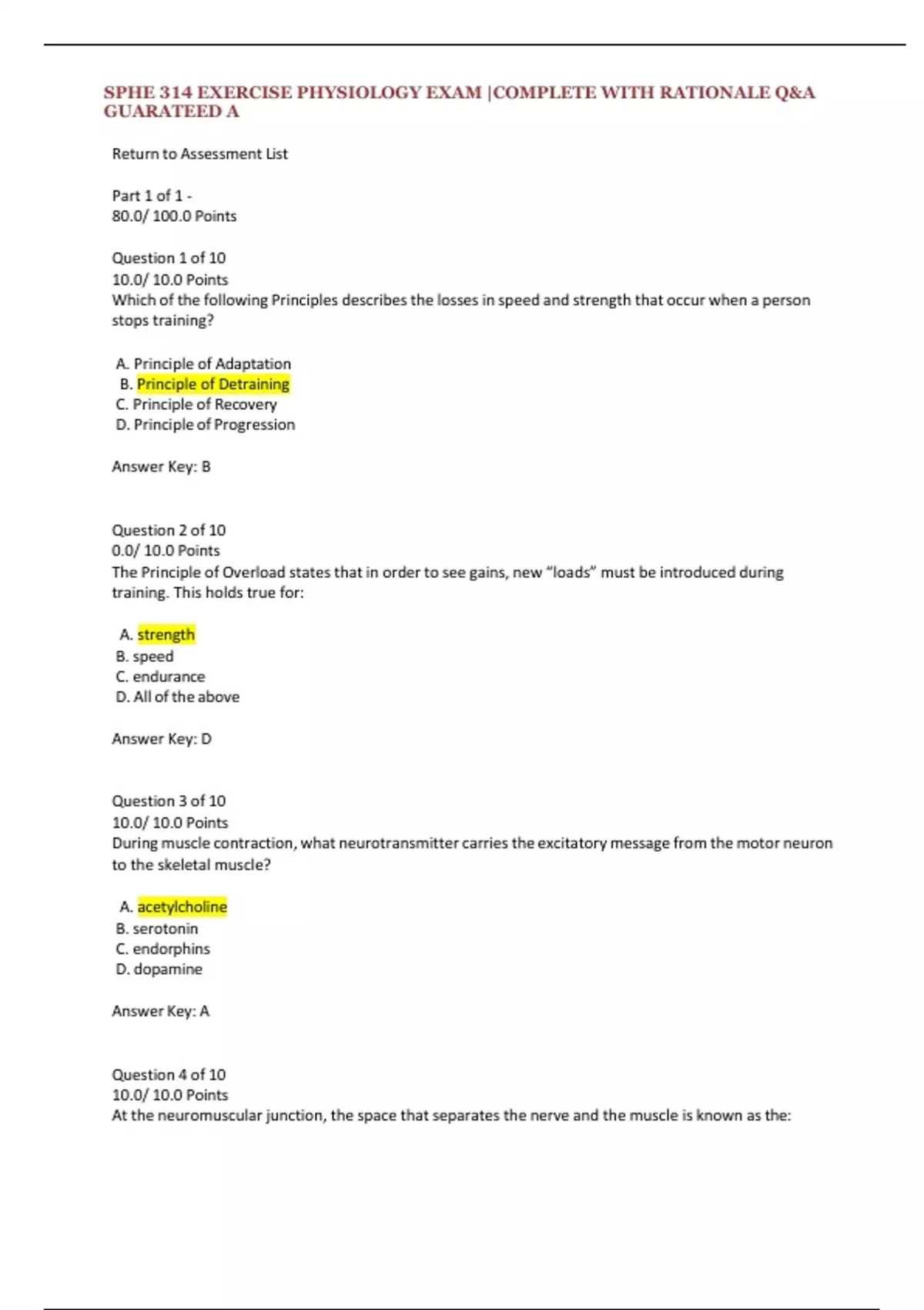 SPHE 314 EXERCISE PHYSIOLOGY EXAM |COMPLETE WITH RATIONALE Q&A