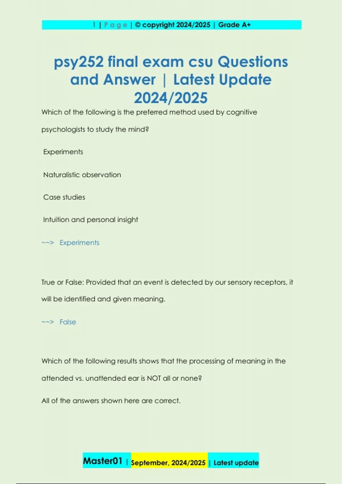 Which of the following is the preferred method used by cognitive psychologists to study the mind? Experiments Naturalistic observation Case studies Intuition and personal insight ~~> Experiments True or False: Provided that an event is detected by our sensory receptors, it will be identified and given meaning. ~~> False Which of the following results shows that the processing of meaning in the attended vs. unattended ear is NOT all or none? All of the answers shown here are correct. 2 | P a g e | © copyright 2024/2025 | Grade A+ Master01 | September, 2024/2025 | Latest update Moray's finding that subjects sometimes report their name when it's presented in the unattended ear. Treisman's finding that subjects will follow a meaningful message over to the unattended ear while shadowing. MacKay's finding that words presented in the unattended ear bias the interpretation of the message in the attended ear. ~~> All of the answers shown here are correct. True or False: Research shows that the sole cause of performance tradeoffs in a multi-tasking situation is the degree to which there is overlap in the type of resources required. ~~> False while the overlap in the type of resources required is one factor that can contribute to performance tradeoffs in multi-tasking, it is not the sole cause. Other factors, such as resource competition, task complexity, task interference, task prioritization, and individual differences, also play important roles. Do hand-less, voice-operated cell phone units solve the problem with driving with cell phones? No, it's an attention problem, which is still at issue in the case of hand-less units. 3 | P a g e | © copyright 2024/2025 | Grade A+ Master01 | September, 2024/2025 | Latest update Yes, because drivers no longer look down at the cell phone and take their eyes off of the road. Yes, because drivers no longer need to hold the cell phone and take one hand off of the steering wheel. Yes, because drivers no longer fumble with trying to press buttons and keys on the phone. ~~> No, it's an attention problem, which is still at issue in the case of handless units. In the movie 50 First Dates, the main character (played by Drew Barrymore) can not remember the events that happened to her the day before. This is characterized in the movie as short term memory loss. Is the writer of this script using the term short-term memory accurately? ~~> No