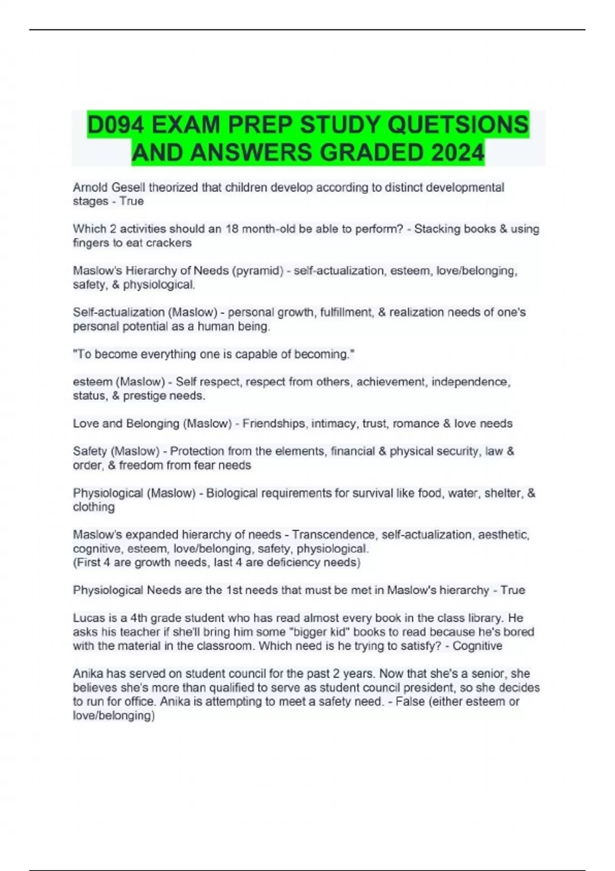 Arnold Gesell theorized that children develop according to distinct developmental stages - True Which 2 activities should an 18 month-old be able to perform? - Stacking books & using fingers to eat crackers Maslow's Hierarchy of Needs (pyramid) - self-actualization, esteem, love/belonging, safety, & physiological. Self-actualization (Maslow) - personal growth, fulfillment, & realization needs of one's personal potential as a human being. "To become everything one is capable of becoming." esteem (Maslow) - Self respect, respect from others, achievement, independence, status, & prestige needs. Love and Belonging (Maslow) - Friendships, intimacy, trust, romance & love needs Safety (Maslow) - Protection from the elements, financial & physical security, law & order, & freedom from fear needs Physiological (Maslow) - Biological requirements for survival like food, water, shelter, & clothing Maslow's expanded hierarchy of needs - Transcendence, self-actualization, aesthetic, cognitive, esteem, love/belonging, safety, physiological. (First 4 are growth needs, last 4 are deficiency needs) Physiological Needs are the 1st needs that must be met in Maslow's hierarchy - True Lucas is a 4th grade student who has read almost every book in the class library. He asks his teacher if she'll bring him some "bigger kid" books to read because he's bored with the material in the classroom. Which need is he trying to satisfy? - Cognitive Anika has served on student council for the past 2 years. Now that she's a senior, she believes she's more than qualified to serve as student council president, so she decides to run for office. Anika is attempting to meet a safety need. - False (either esteem or love/belonging)