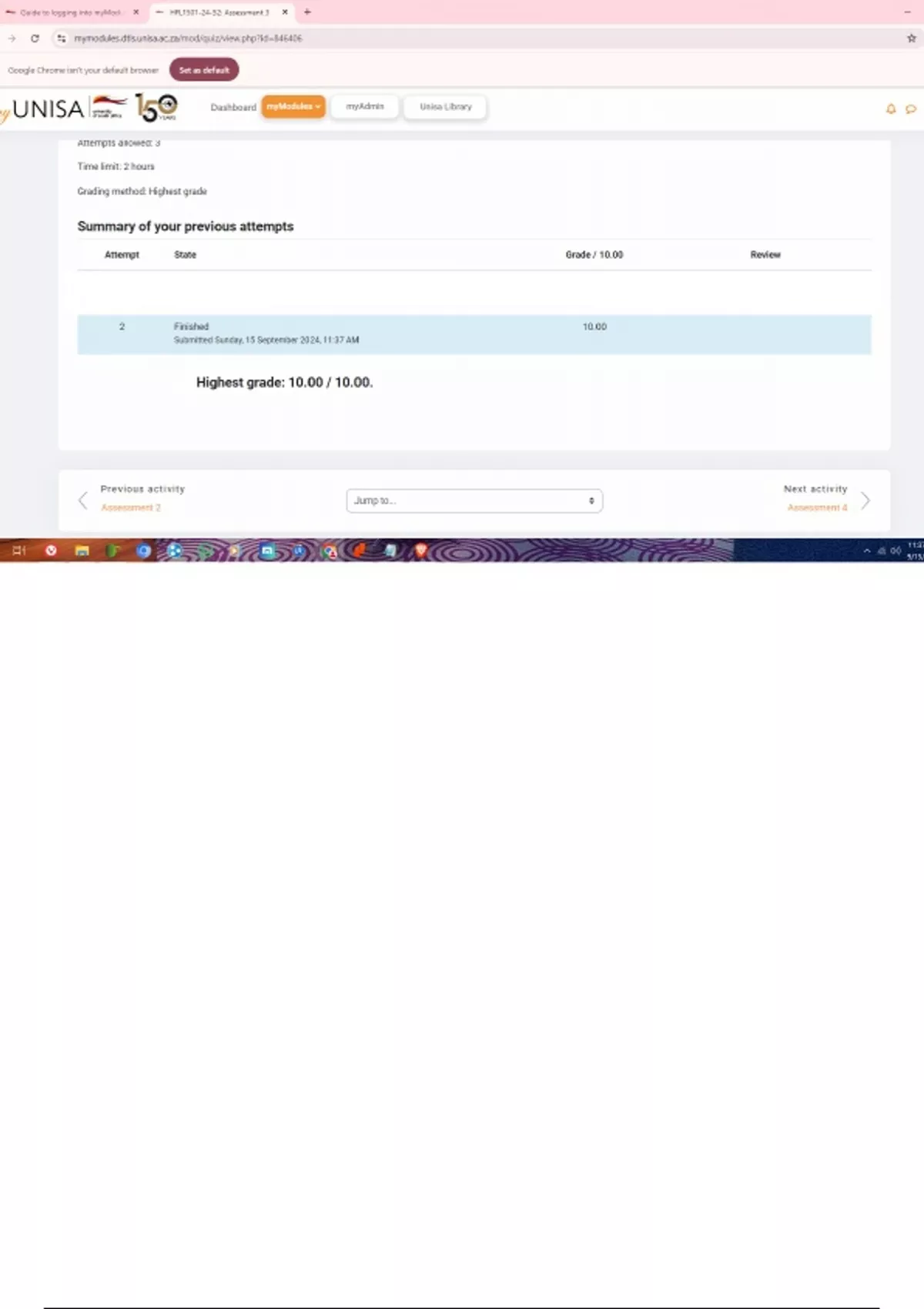 NISA2-: 15° myAdmin Unisa Library 4 0 TZ Attempts aniowe: Time limit. 2 hours Grading method Highest grade Summary of your previous attempts Attempt State Grade/ 10.00 Review 2 Finished 10.00 Submitted Sunday, 15 September 2024, 11.37 AM Highest grade: 10.00 / 10.00. Previous activity < Next activity [ Jumpto .. Assessment 2 Assessment 4 >