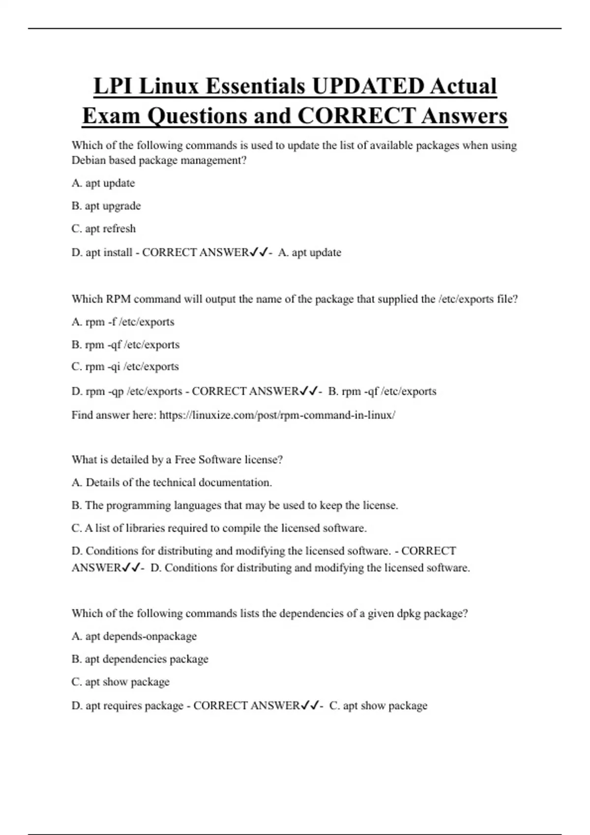 LPI Linux Essentials UPDATED Actual Exam Questions and CORRECT Answers Which of the following commands is used to update the list of available packages when using Debian based package management? A. apt update B. apt upgrade C. apt refresh D. apt install - CORRECT ANSWER- A. apt update