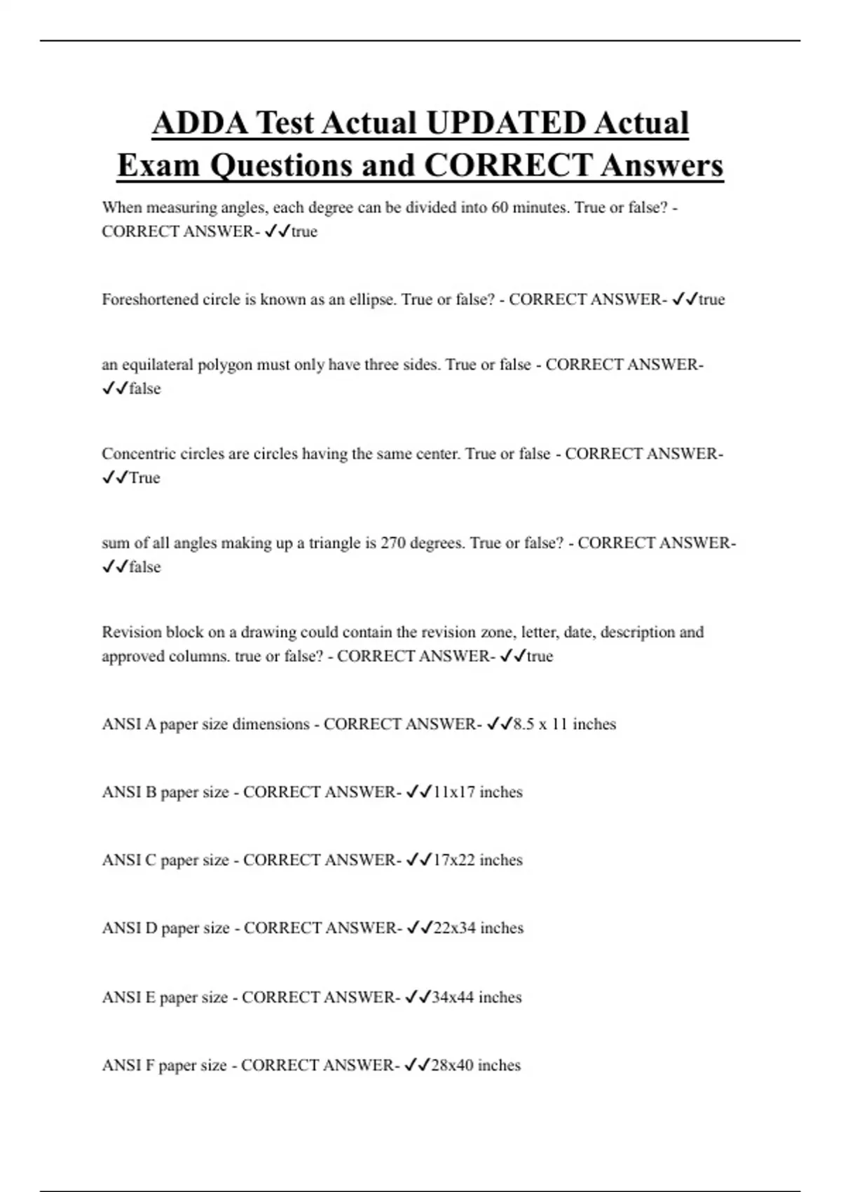 ADDA Test Actual UPDATED Actual Exam Questions and CORRECT Answers When measuring angles, each degree can be divided into 60 minutes. True or false? - CORRECT ANSWER- true Foreshortened circle is known as an ellipse. True or false? - CORRECT ANSWER- true an equilateral polygon must only have three sides. True or false - CORRECT ANSWER- false