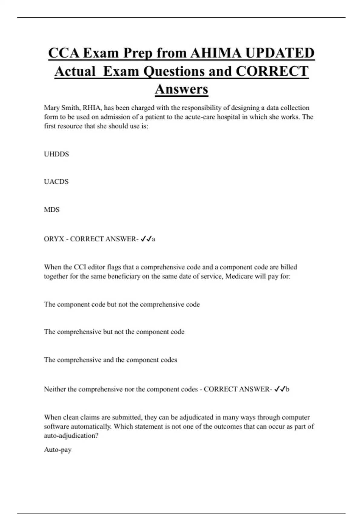 CCA Exam Prep from AHIMA UPDATED Actual Exam Questions and CORRECT Answers Mary Smith, RHIA, has been charged with the responsibility of designing a data collection form to be used on admission of a patient to the acute-care hospital in which she works. The first resource that she should use is: UHDDS UACDS MDS ORYX - CORRECT ANSWER- a