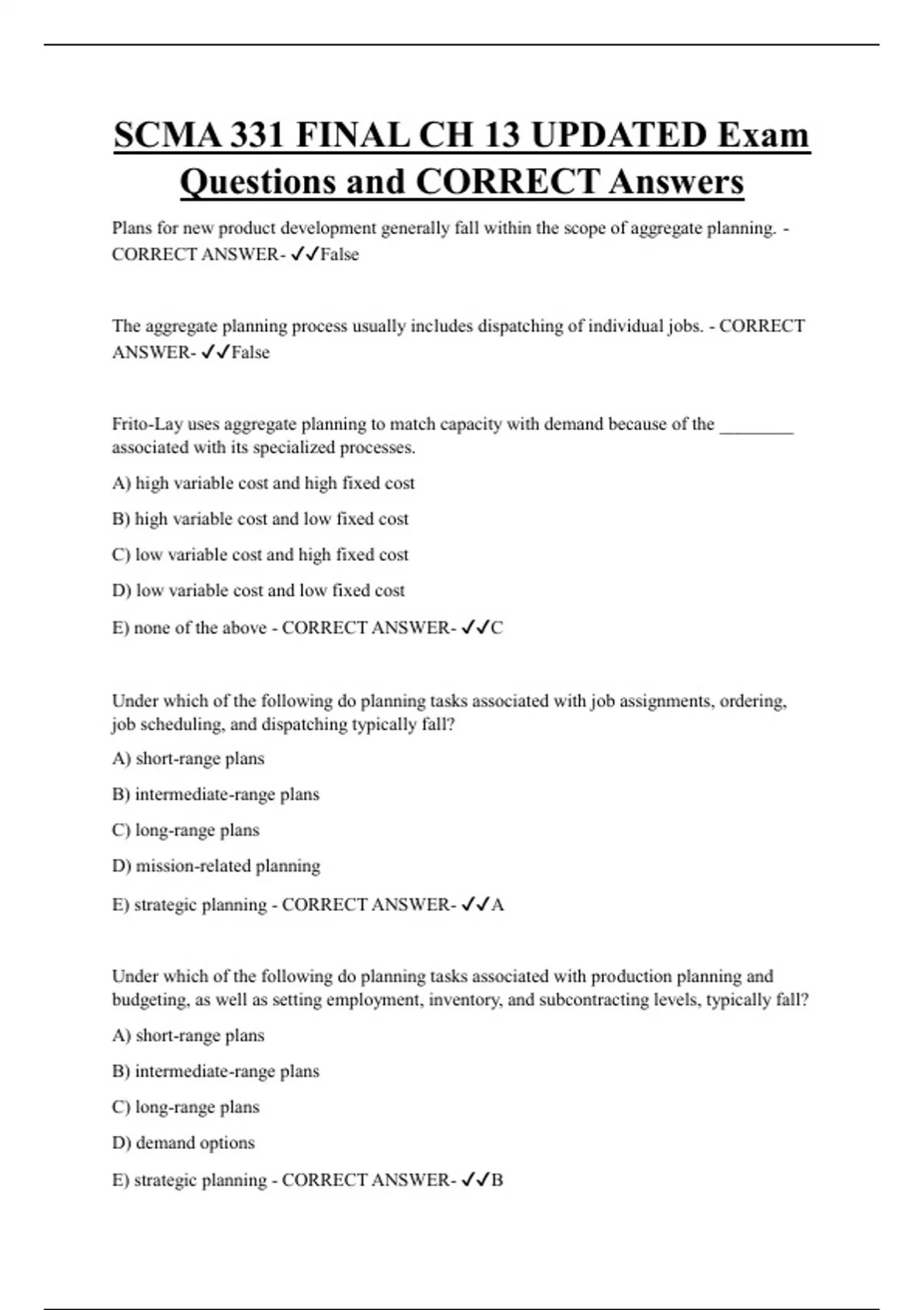 SCMA 331 FINAL CH 13 UPDATED Exam Questions and CORRECT Answers Plans for new product development generally fall within the scope of aggregate planning. - CORRECT ANSWER- False The aggregate planning process usually includes dispatching of individual jobs. - CORRECT ANSWER- False Frito-Lay uses aggregate planning to match capacity with demand because of the ________ associated with its specialized processes. A) high variable cost and high fixed cost B) high variable cost and low fixed cost C) low variable cost and high fixed cost D) low variable cost and low fixed cost E) none of the above - CORRECT ANSWER- C