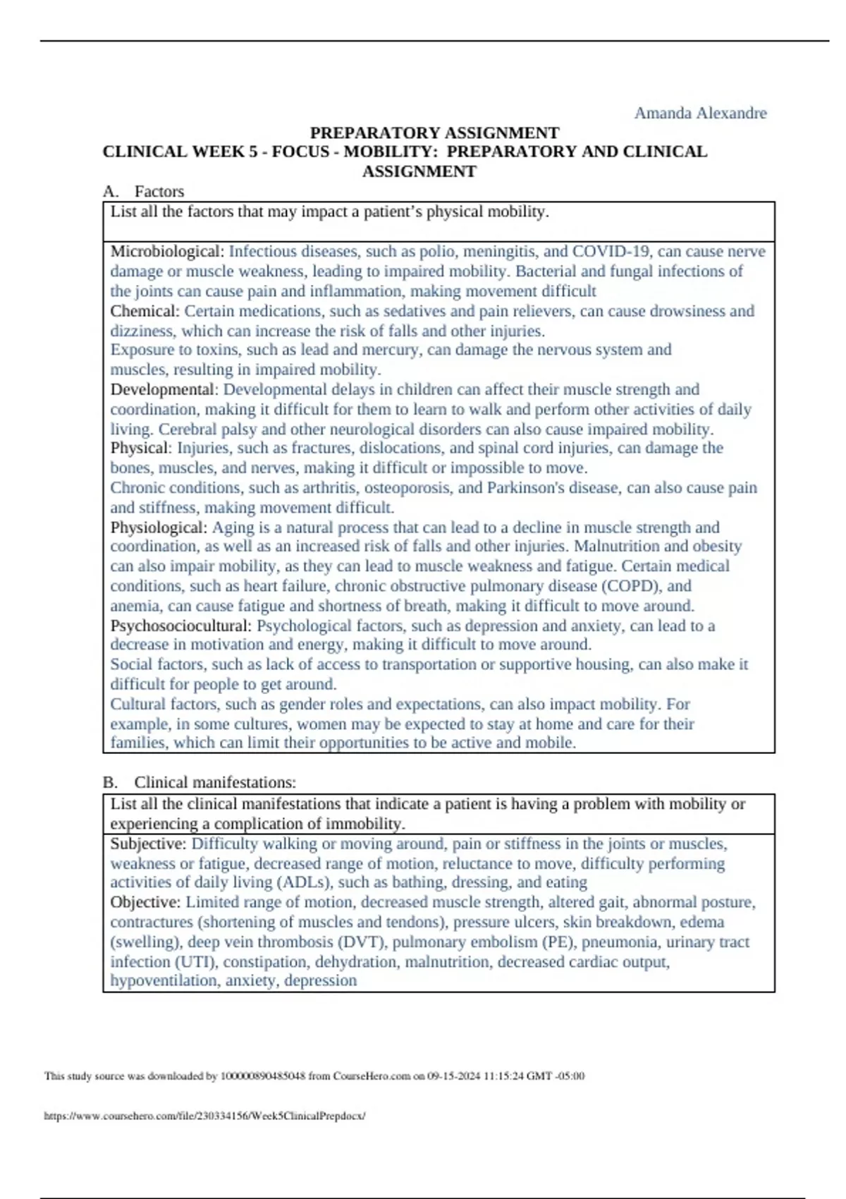 NUR 105 PREPARATORY ASSIGNMENT CLINICAL WEEK 5 - FOCUS - MOBILITY: PREPARATORY AND CLINICAL ASSIGNMENT