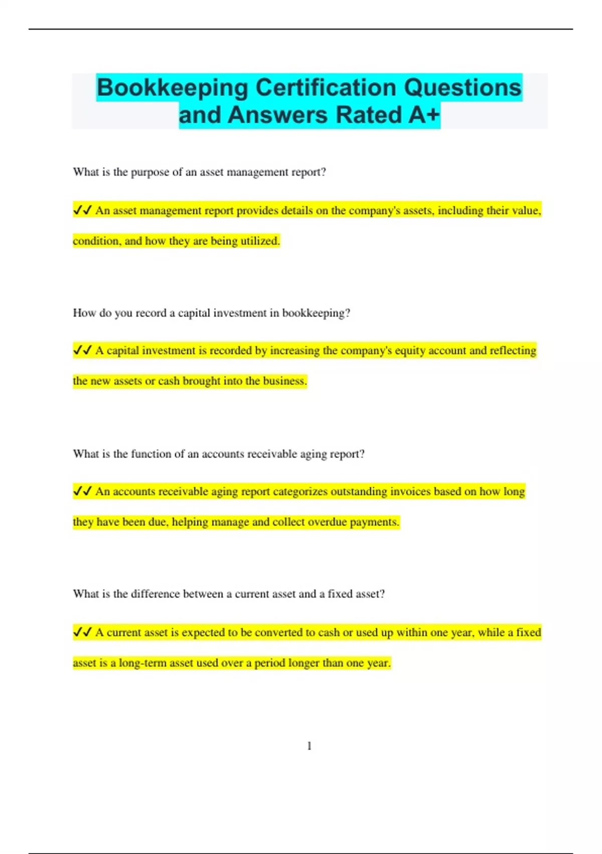 Bookkeeping Certification Questions and Answers Rated A+ What is the purpose of an asset management report? An asset management report provides details on the company's assets, including their value, condition, and how they are being utilized. How do you record a capital investment in bookkeeping? A capital investment is recorded by increasing the company's equity account and reflecting the new assets or cash brought into the business. What is the function of an accounts receivable aging report? An accounts receivable aging report categorizes outstanding invoices based on how long they have been due, helping manage and collect overdue payments. What is the difference between a current asset and a fixed asset? A current asset is expected to be converted to cash or used up within one year, while a fixed asset is a long-term asset used over a period longer than one year. 2 How do you handle bad debt in bookkeeping? Bad debt is recorded as an expense when it is determined that an amount owed by a customer is uncollectible, affecting the accounts receivable and expense accounts. What is the role of internal controls in bookkeeping? Internal controls are procedures implemented to safeguard assets, ensure accurate financial reporting, and prevent fraud and errors in the accounting system. What is a cash flow statement used for? A cash flow statement tracks the cash inflows and outflows of a business, providing insight into its liquidity and financial health. How do you account for interest income in bookkeeping? Interest income is recorded as revenue when it is earned, increasing the income account and reflecting the amount of interest received. What is the purpose of a bank reconciliation statement? A bank reconciliation statement is used to compare the company's bank statement with its own records to identify and correct any discrepancies. 3 How do you manage inventory in bookkeeping? Inventory is managed by tracking stock levels, recording purchases and sales, and adjusting the inventory account to reflect accurate quantities and values. What is the purpose of a reconciliation statement? A reconciliation statement is used to compare and align the company's financial records with external documents like bank statements to ensure accuracy. How do you record a business expense? To record a business expense, you enter the amount spent into the appropriate expense account and note the transaction details, ensuring it is documented