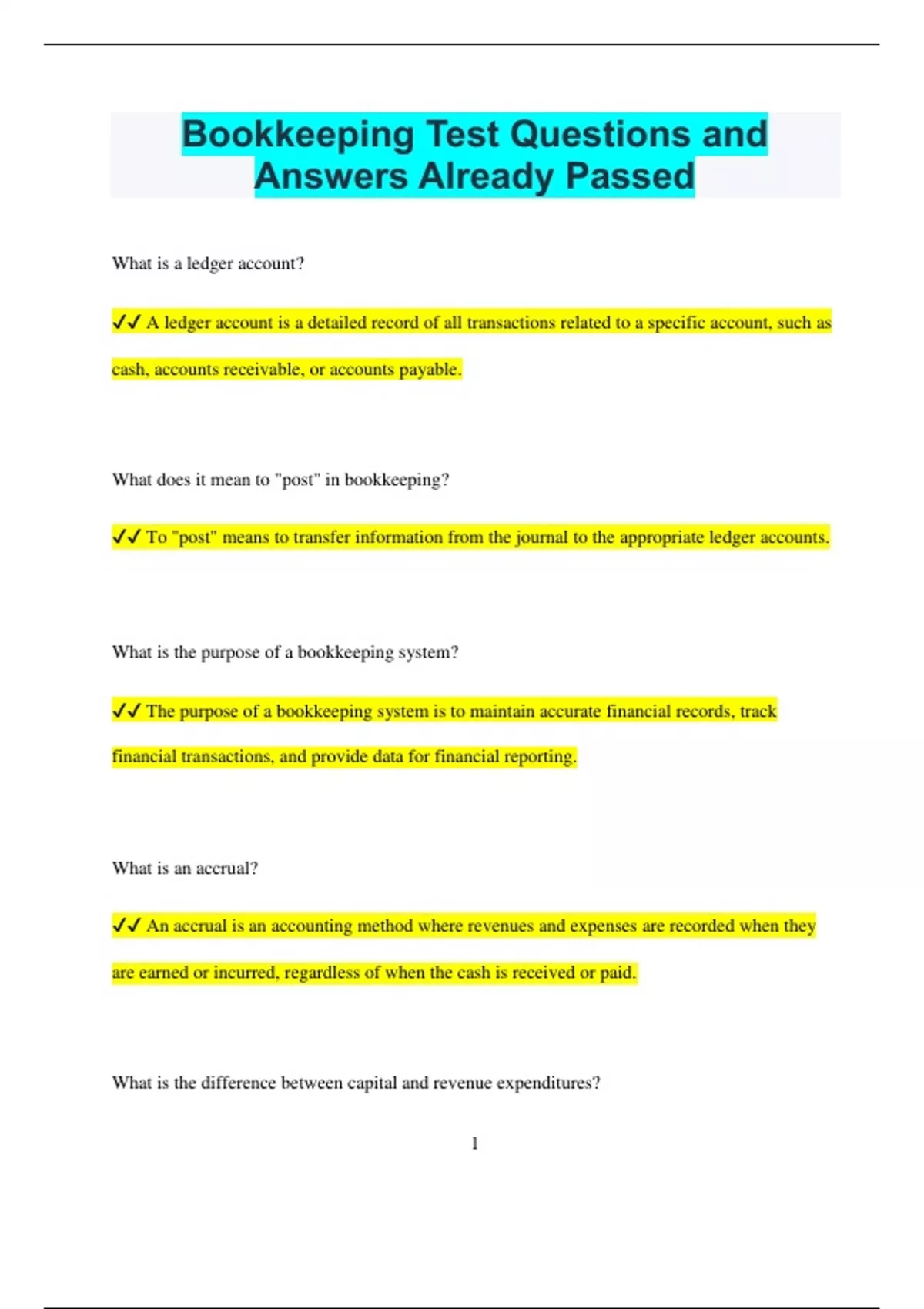 Bookkeeping Test Questions and Answers Already Passed What is a ledger account? A ledger account is a detailed record of all transactions related to a specific account, such as cash, accounts receivable, or accounts payable. What does it mean to "post" in bookkeeping? To "post" means to transfer information from the journal to the appropriate ledger accounts. What is the purpose of a bookkeeping system? The purpose of a bookkeeping system is to maintain accurate financial records, track financial transactions, and provide data for financial reporting. What is an accrual? An accrual is an accounting method where revenues and expenses are recorded when they are earned or incurred, regardless of when the cash is received or paid. What is the difference between capital and revenue expenditures? 2 Capital expenditures are investments in long-term assets that benefit the business for more than one accounting period, while revenue expenditures are short-term costs that are expensed in the period they are incurred. What is a cash flow statement? A cash flow statement reports the cash inflows and outflows from operating, investing, and financing activities over a specific period. How do you record depreciation in bookkeeping? Depreciation is recorded as an expense in the income statement and a reduction in the value of the related asset in the balance sheet. What is the purpose of a subsidiary ledger? A subsidiary ledger provides detailed information for a specific account, such as accounts receivable or accounts payable, which supports the general ledger. What is a chart of accounts? A chart of accounts is a list of all accounts used by a business, organized by category, to help in the recording and reporting of financial