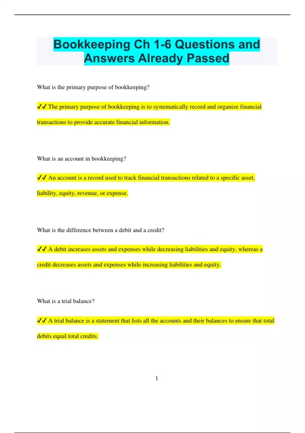 Bookkeeping Ch 1-6 Questions and Answers Already Passed