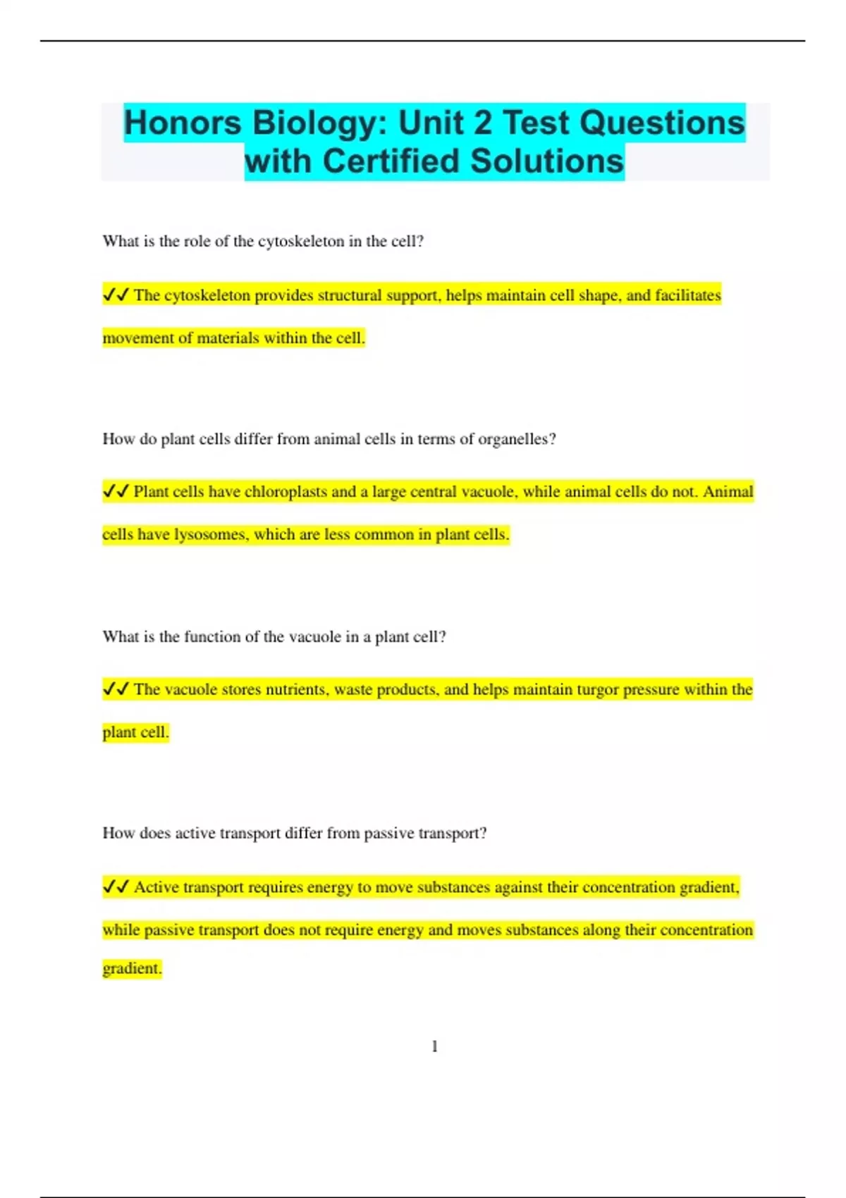Honors Biology: Unit 2 Test Questions with Certified Solutions