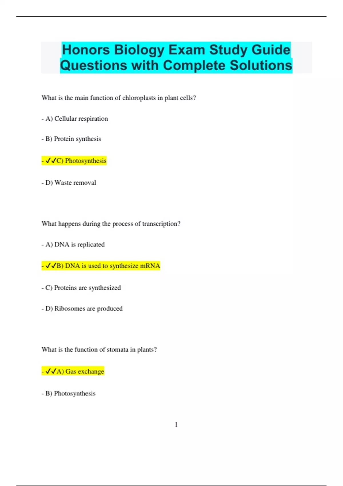 Honors Biology Exam Study Guide Questions with Complete Solutions What is the main function of chloroplasts in plant cells? - A) Cellular respiration - B) Protein synthesis - C) Photosynthesis - D) Waste removal What happens during the process of transcription? - A) DNA is replicated - B) DNA is used to synthesize mRNA - C) Proteins are synthesized - D) Ribosomes are produced What is the function of stomata in plants? - A) Gas exchange - B) Photosynthesis 2 - C) Energy storage - D) Water absorption What is the role of nitrogenous bases in DNA? - A) They provide structural support - B) They carry genetic information - C) They store energy - D) They protect the cell What is the significance of homologous structures in evolution? - A) They indicate a common ancestor - B) They serve identical functions - C) They evolve independently - D) They provide energy What is the primary source of energy for all living organisms? - A) Water - B) Carbon dioxide 3 - C) The sun - D) Oxygen How do mutations affect genetic diversity? - A) Mutations reduce genetic diversity - B) Mutations have no effect on genetic diversity - C) Mutations increase genetic diversity - D) Mutations eliminate genetic diversity What occurs during the process of translation? - A) mRNA is used to synthesize proteins - B) DNA is replicated