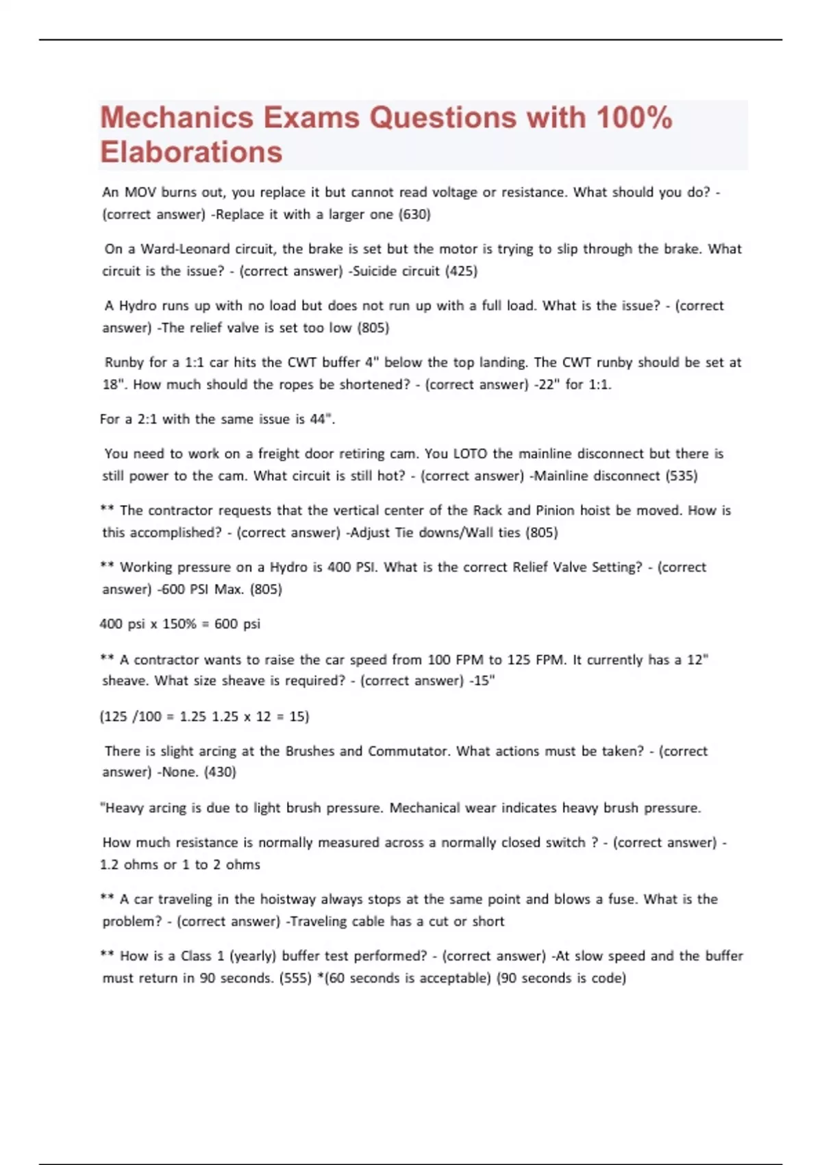 Mechanics Exams Questions with 100% Elaborations .An .MOV .burns .out, .you .replace .it .but .cannot .read .voltage .or .resistance. .What .should .you .do? .- .(correct .answer) .-Replace .it .with .a .larger .one .(630) .On .a .Ward-Leonard .circuit, .the .brake .is .set .but .the .motor .is .trying .to .slip .through .the .brake. .What .circuit .is .the .issue? .- .(correct .answer) .-Suicide .circuit .(425) .A .Hydro .runs .up .with .no .load .but .does .not .run .up .with .a .full .load. .What .is .the .issue? .- .(correct .answer) .-The .relief .valve .is .set .too .low .(805) .Runby .for .a .1:1 .car .hits .the .CWT .buffer .4" .below .the .top .landing. .The .CWT .runby .should .be .set .at .18". .How .much .should .the .ropes .be .shortened? .- .(correct .answer) .-22" .for .1:1. . For .a .2:1 .with .the .same .issue .is .44". .You .need .to .work .on .a .freight .door .retiring .cam. .You .LOTO .the .mainline .disconnect .but .there .is .still .power .to .the .cam. .What .circuit .is .still .hot? .- .(correct .answer) .-Mainline .disconnect .(535) ** .The .contractor .requests .that .the .vertical .center .of .the .Rack .and .Pinion .hoist .be .moved. .How .is .this .accomplished? .- .(correct .answer) .-Adjust .Tie .downs/Wall .ties .(805) ** .Working .pressure .on .a .Hydro .is .400 .PSI. .What .is .the .correct .Relief .Valve .Setting? .- .(correct .answer) .-600 .PSI .Max. .(805) 400 .psi .x .150% .= .600 .psi ** .A .contractor .wants .to .raise .the .car .speed .from .100 .FPM .to .125 .FPM. .It .currently .has .a .12" .sheave. .What .size .sheave .is .required? .- .(correct .answer) .-15" (125 ./100 .= .1.25 .1.25 .x .12 .= .15) .There .is .slight .arcing .at .the .Brushes .and .Commutator. .What .actions .must .be .taken? .- .(correct .answer) .-None. .(430) "Heavy .arcing .is .due .to .light .brush .pressure. .Mechanical .wear .indicates .heavy .brush .pressure. .How .much .resistance .is .normally .measured .across .a .normally .closed .switch .? .- .(correct .answer) .-1.2 .ohms .or .1 .to .2 .ohms ** .A .car .traveling .in .the .hoistway .always .stops .at .the .same .point .and .blows .a .fuse. .What .is .the .problem? .- .(correct .answer) .-Traveling .cable .has .a .cut .or .short ** .How .is .a .Class .1 .(yearly) .buffer .test .performed? .- .(correct .answer) .-At .slow .speed .and .the .buffer .must .return .in .90 .seconds. .(555) .*(60 .seconds .is .acceptable) .(90 .seconds .is .code) 5 .year .test .(Class .5) .is .car .at .rated .load .and .speed. .Buffer .must .return .in .90 .seconds. .CWT .at .rated .speed .and .buffer .must .return .in .90 .seconds. ** .How .many .Strain .Supports .are .required .on .a .350' .raceway? .- .(correct .answer) .-4 One .for .every .100' .How .is .Stainless .steel .drilled .out? .- .(correct .answer) .-Slow .speed .and .constant .pressure .(205) .What .are .the .required .amount .of .clips .for .Wedge .Shackles .and .what .is .their .spacing? .- .(correct .answer) .-At .least .2, .with .the .first .being .4 .times .the .diameter .of .the .rope .from .the .top .of .shackle. . Second .is .8 .times .the .diameter .of .the .rope .from .the .first.* .Car .is .loaded .with .125% .and .sinks. .Why? .- .(correct .answer) .-Slipped .through .the .brake. .A .300 .Ohm .resistor .burns .out. .You .don't .have .a .300 .Ohm .resistor .to .replace .it. .What .can .you .use .to .make .up .the .resistor? .- .(correct .answer) .-2 .600 .Ohms .resistors .in .Parallel. ."The .resistance .is .half .of .the .highest .rating .in .a .parallel .circuit. . 3, .225 .Ohm .resistors .in .parallel .equal .75 .Ohms. ** .A .480 .VAC .Step .Down .Transformer .is .connected .to .a .3 .phase .rectifier. .What .will .the .output .be? .- .(correct .answer) .-320 .VDC 480 .- .33.33% .= .320 .If .you .find .a .broken .or .missing .barricade, .what .do .you .do? .- .(correct .answer) .-Write .up .a .formal .inspection .request. .If .a .Dumbwaiter .has .9 .square .feet .in .Area, . 4 .' .High .and .the .rated .Capacity .is .13.9 .lb/ft3, .what .is .the .total .capacity? .- .(correct .answer) .-500 .lb/ft3. . "The .area .of .a .Dumbwaiter .is .9 .sq' .max .and .is .4' .High. .Multiply .that .by .13.9. . 9x4 .= .36. .36 .x .13.9 .= .500 ** .What .are .the .consequences .of .a .misaligned .Rack .and .Pinion .hoist .joint? .- .(correct .answer) .-Broken .Gear .Teeth .(850) .Motor .not .aligned. ** .You .enter .a .Pit .where .toxic .fumes .are .present. .How .do .you .proceed? .- .(correct .answer) .-Follow .proper .procedures. . "Confined .Space .entry .procedures .are .now .guided .by .OSHA .for .pit .entry". ** .When .changing .a .1:1 .car .rated .at .600 .FPM .and .2000 .lb .capacity .to .a .2:1, .what .will .the .new .ratings .be? .- .(correct .answer) .-300 .FPM .and .4000 .lb .capacity. .