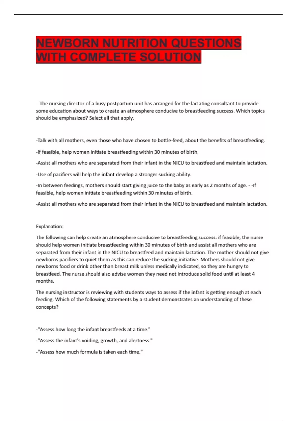 Exam of 11 pages for the course Newborn Nutrition at Newborn Nutrition (Newborn Nutrition)