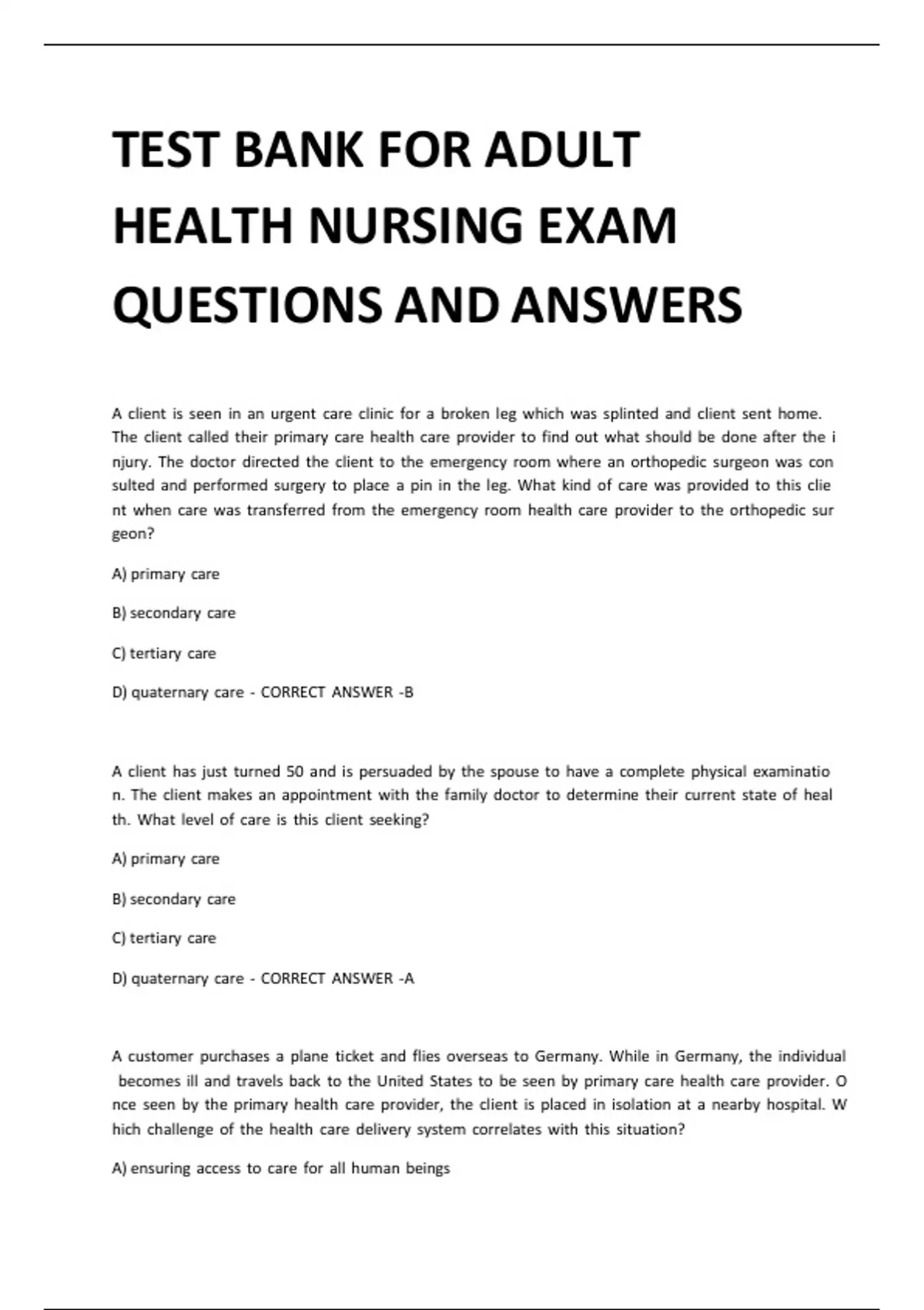 TEST BANK FOR ADULT HEALTH NURSING EXAM QUESTIONS AND ANSWERS