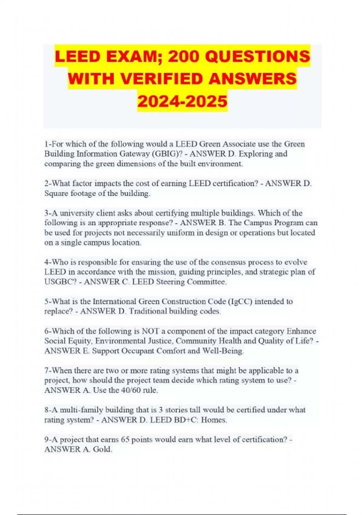 ALL LEED GREEN ASSOCIATE PACKAGED EXAMS WITH ALL DETAILED QUESTIONS AND 100% VERIFIED ANSWERS LATEST UPDATED