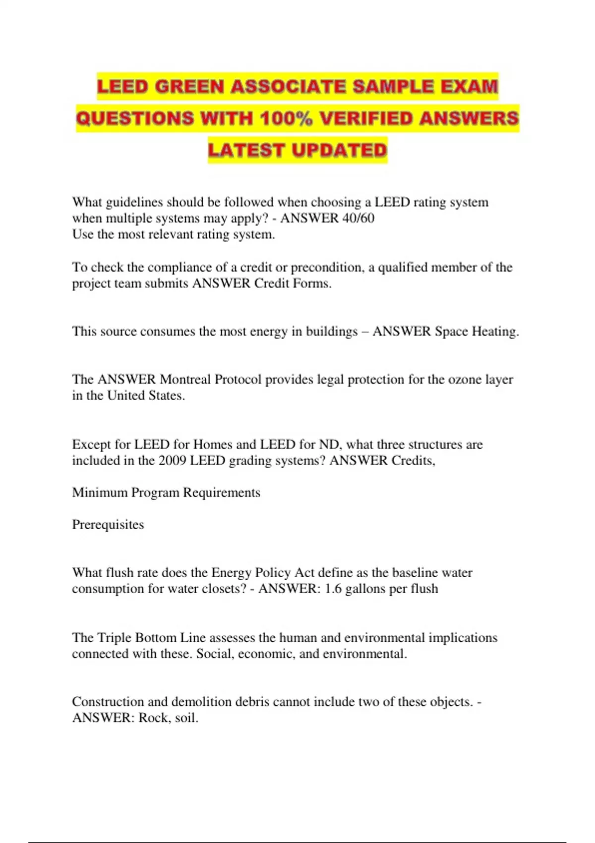 LEED GREEN ASSOCIATE SAMPLE EXAM QUESTIONS WITH 100% VERIFIED ANSWERS LATEST UPDATED...