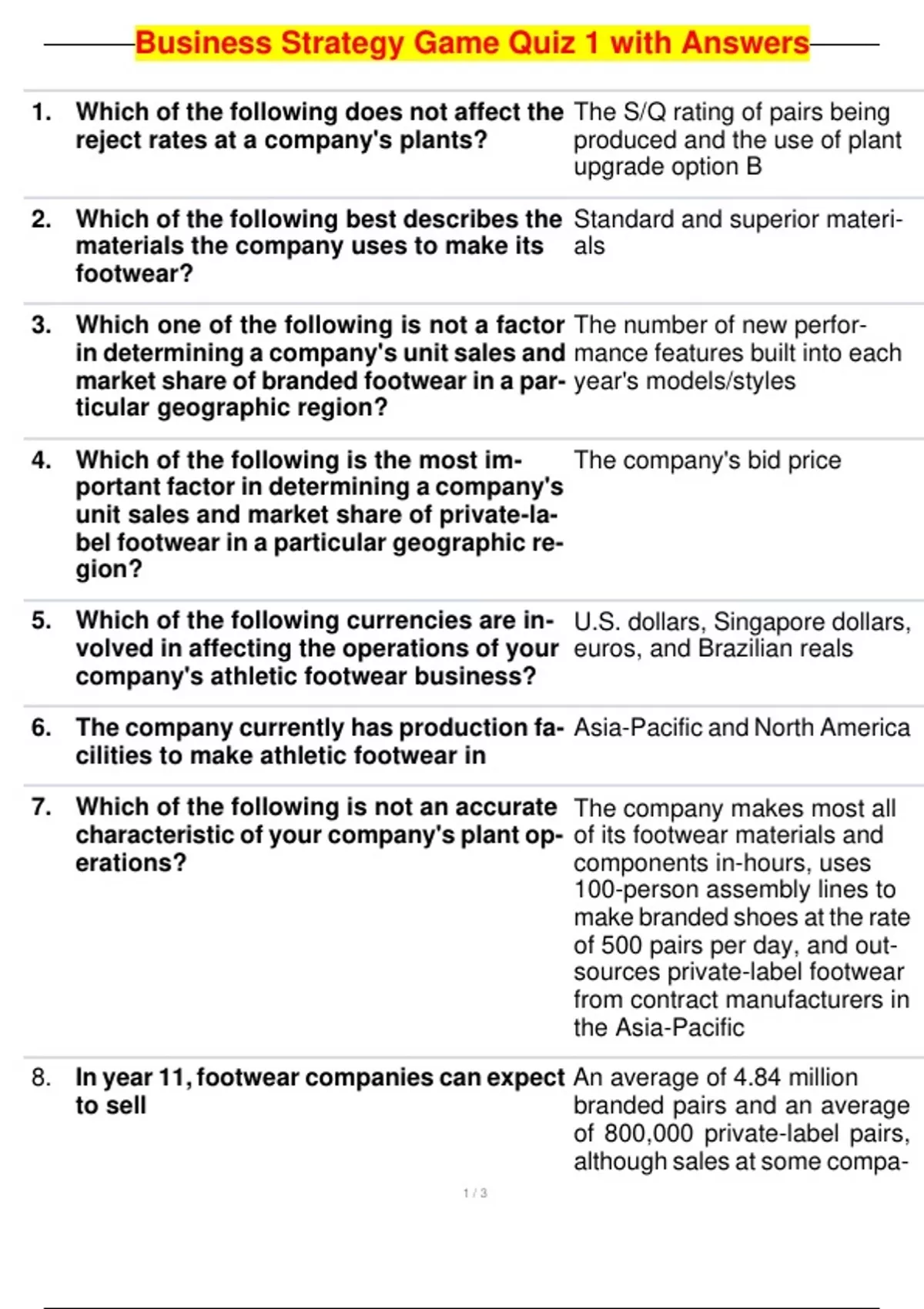 Business Strategy Game Quiz 1 with Answers 1. Which of the following does not affect the reject rates at a company's plants? 2. Which of the following best describes the materials the company uses to make its footwear? 3. Which one of the following is not a factor in determining a company's unit sales and market share of branded footwear in a par- ticular geographic region? 4. Which of the following is the most im- portant factor in determining a company's unit sales and market share of private-la- bel footwear in a particular geographic re- gion? 5. Which of the following currencies are in- volved in affecting the operations of your company's athletic footwear business? 6. The company currently has production fa- cilities to make athletic footwear in 7. Which of the following is not an accurate characteristic of your company's plant op- erations? The S/Q rating of pairs being produced and the use of plant upgrade option B Standard and superior materi- als The number of new perfor- mance features built into each year's models/style