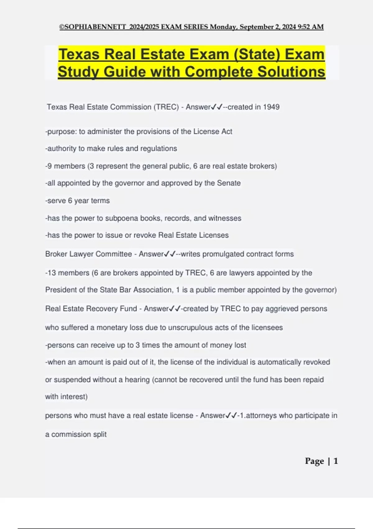 Texas Real Estate Commission (TREC) - Answer✔️✔️--created in 1949