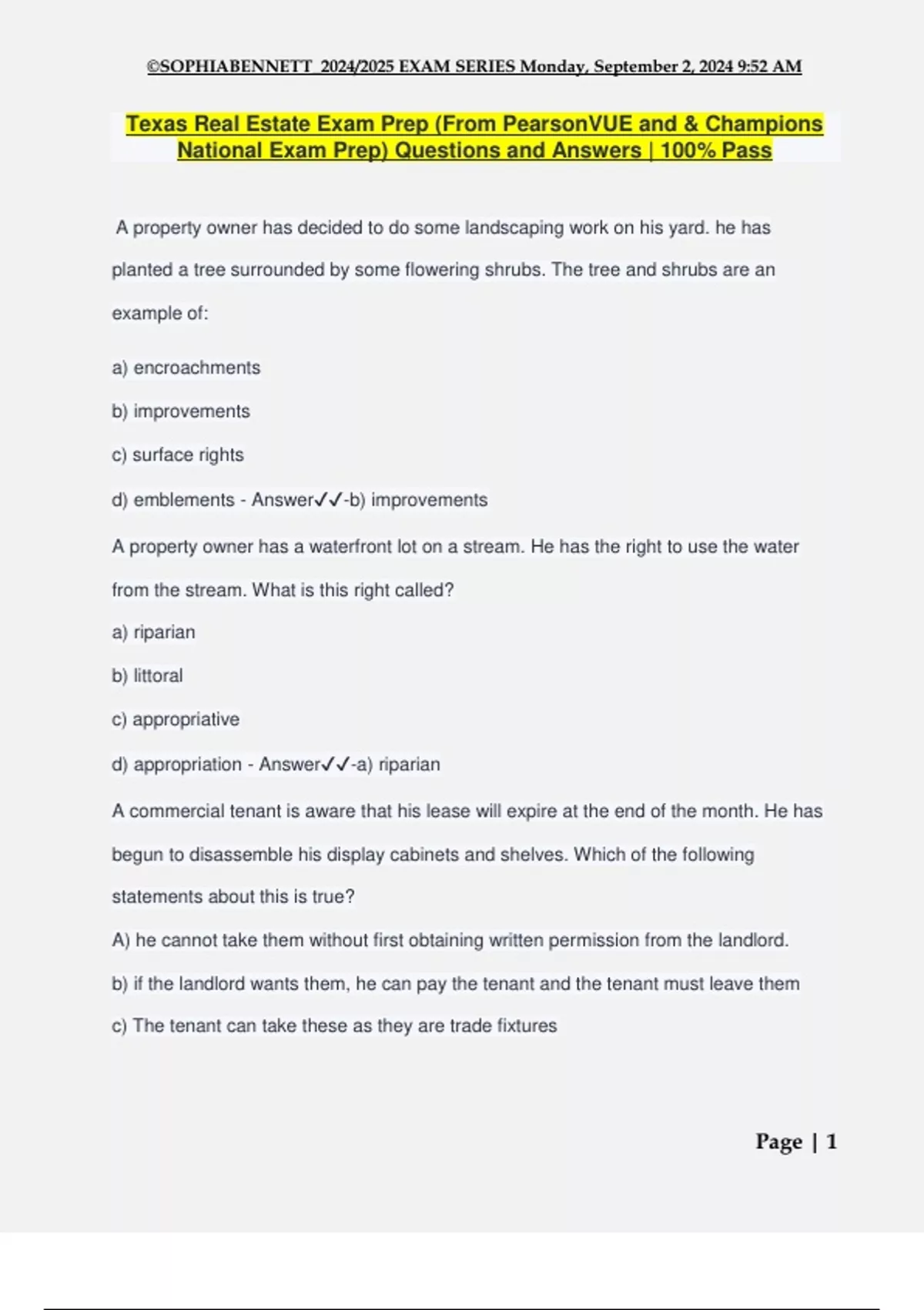 Texas Real Estate Exam Prep (From PearsonVUE and & Champions National Exam Prep) Questions and Answers | 100% Pass