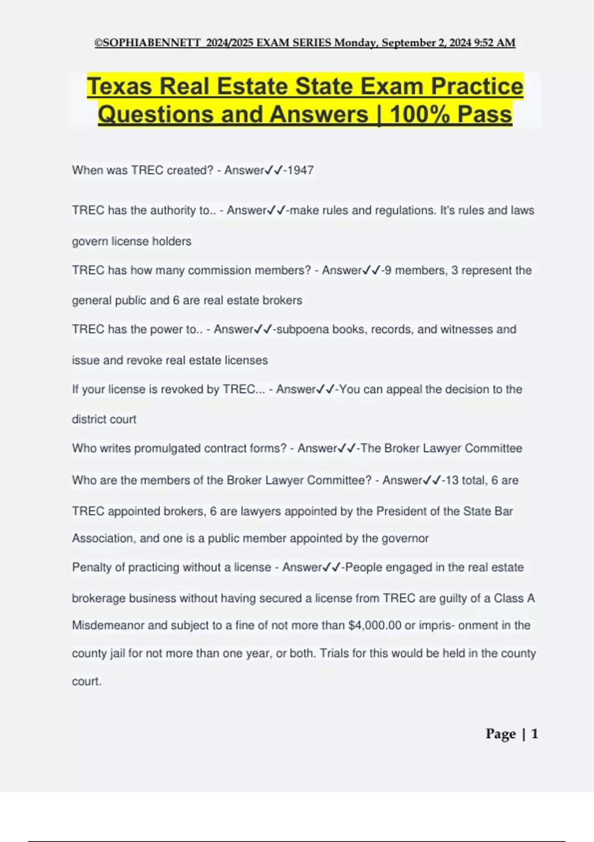 Texas Real Estate State Exam Practice Questions and Answers | 100% Pass When was TREC created? - Answer️️ -1947 TREC has the authority to.. - Answer️️ -make rules and regulations. It's rules and laws govern license holders TREC has how many commission members? - Answer️️ -9 members, 3 represent the general public and 6 are real estate brokers TREC has the power to.. - Answer️️ -subpoena books, records, and witnesses and issue and revoke real estate licenses If your license is revoked by TREC... - Answer️️ -You can appeal the decision to the district court Who writes promulgated contract forms? - Answer️️ -The Broker Lawyer Committee Who are the members of the Broker Lawyer Committee? - Answer️️ -13 total, 6 are TREC appointed brokers, 6 are lawyers appointed by the President of the State Bar Association, and one is a public member appointed by the governor Penalty of practicing without a license - Answer️️ -People engaged in the real estate brokerage business without having secured a license from TREC are guilty of a Class A Misdemeanor and subject to a fine of not more than $4,000.00 or impris- onment in the county jail for not more than one year, or both. Trials for this would be held in the county court. ©SOPHIABENNETT_2024/2025 EXAM SERIES Monday, September 2, 2024 9:52 AM Page | 2 In addition, persons guilty of a violation of the License Act and whoever profited there from are liable for additional civil penalties of up to three times the amount of money received. TREC penalty of violating license act - Answer️️ -TREC may assess an administrative penalty of up to $5,000 per day for violation of the license act by any person, either licensed or unlicensed. If TREC assesses a penalty, a license holder has 30 days to pay the penalty. Unlicensed assistant is only allowed to - Answer️️ -do clerical duties and greet at an open house If an unlicensed assistant does work requiring a license, the penalty is - Answer️️ - both realtor and assistant get fined Real Estate Recovery Trust Account - Answer️️ -It was created by TREC to pay aggrieved persons who suffered a monetary loss due to unscrupulous acts of the license holders. These persons can receive up to three times the amount of money lost. If at any time in the calendar year the account balance is below $1,000,000 the Real Estate Recovery Trust Account can... - Answer️️ -the commission is authorized to assess each real estate broker and salesman on renewal of his license during the following calendar year a fee of $10.00, or a pro rata share of the amount necessary to bring the balance to $1,700,000. TREC invests the fees that have been deposited when the recovery trust account is above the statutory minimum, to offset future claims. TREC only invests in Treasury Bills or Notes, or in the same manner as the Employees Retirement System of Texas. If the bal- ance in the account exceeds $3.5 million the excess goes into the state's General Fund. ©SOPHIABENNETT_2024/2025 EXAM SERIES Monday, September 2, 2024 9:52 AM Page | 3 If the Recovery Trust Account balance is not below $1,000,000... - Answer️️ -TREC simply continues to invest the funds. When an amount is paid out of the Real Estate Recovery Trust Account on behalf of a license holder... - Answer️️ -the license of the individual can be revoked or suspended. This license may never be recovered until the account has been repaid with interest. ***State law limits the maximum payment, which is $100,000 per license holder & $50,000 per transaction. People exempt from real estate licensing - Answer️️ -1. Texas licensed attorneys can handle a real estate transaction for a client for a fee as long as they do not participate in broker to broker commission splits. Any attorney licensed in a state other than Texas will need to be licensed in Texas (as an attorney) to handle a real estate transaction for a client for a fee in Texas. 2. Court appointed receivers, trustees, guardians, and sheriffs. 3. Administrators and executors of a will. 4. On-site apartment managers. 5. New home salesmen working for one builder or owner. 6. Cemetery lot salesmen. 7. A person selling his own property. 8. An employee leasing or renting property for the owner. 9. Corporate employees selling corporate property. 10. Hotel/motel personnel. 11. An attorney-in-fact. 12. An auctioneer calling a real estate auction. ©SOPHIABENNETT_2024/2025 EXAM SERIES Monday, September 2, 2024 9:52 AM Page | 4 13. Anyone selling mobile homes. 14. Anyone engaging in or carrying out foreclosure sales. People who must be licensed - Answer️️ -1. Attorneys must have a real estate license to participate in a commission split. 2. Auctioneers involved in any part of a real estate transaction. 3. Apartment locators. 4. Real Estate salespeople. 5. The designated officer of a licensed real estate corporation, or the designated manager of a licensed Real Estate Limited Liability Company. The designated one is a broker. If a des- ignated agent has a less than 10% interest in a real estate business entity, he must provide proof that the entity has E&O insurance with a minimum annual limit of $1 million per occurrence. If the agent owns 10% o