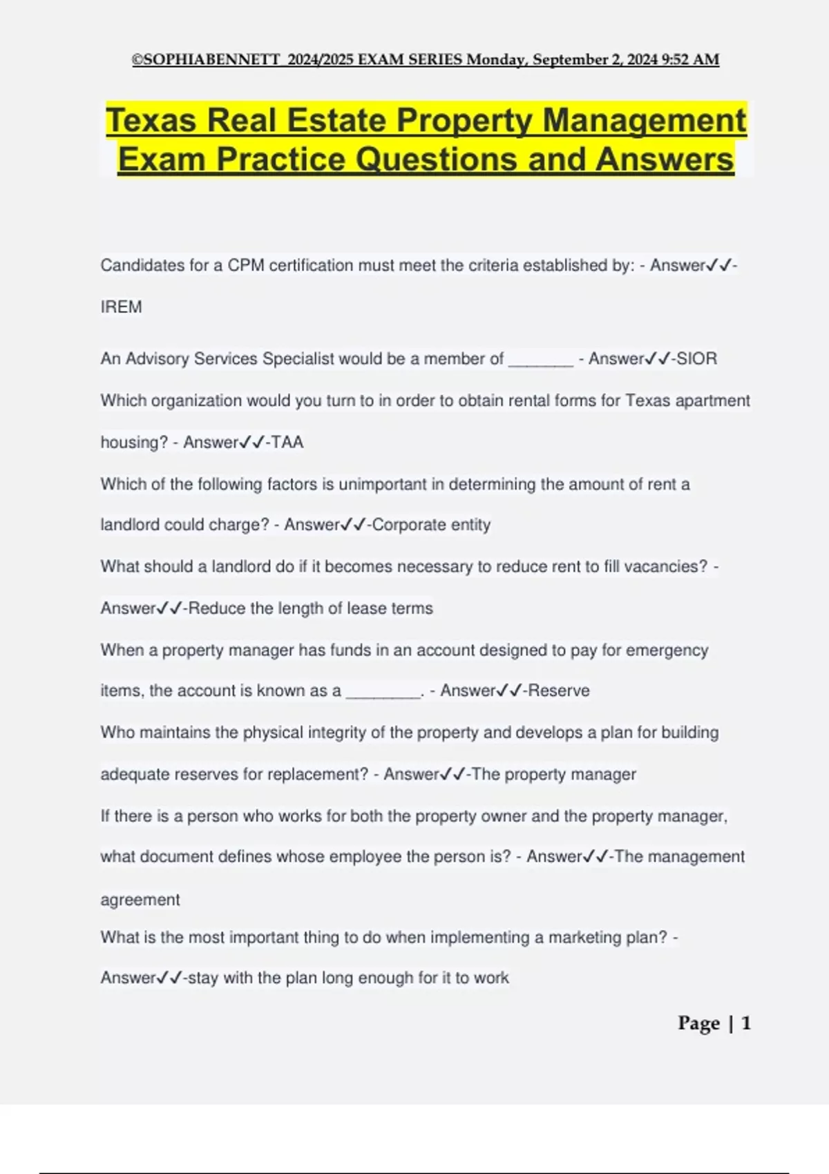Texas Real Estate Property Management Exam Practice Questions and Answers Candidates for a CPM certification must meet the criteria established by: - Answer️️ - IREM An Advisory Services Specialist would be a member of _______ - Answer️️ -SIOR Which organization would you turn to in order to obtain rental forms for Texas apartment housing? - Answer️️ -TAA Which of the following factors is unimportant in determining the amount of rent a landlord could charge? - Answer️️ -Corporate entity What should a landlord do if it becomes necessary to reduce rent to fill vacancies? - Answer️️ -Reduce the length of lease terms When a property manager has funds in an account designed to pay for emergency items, the account is known as a ________. - Answer️️ -Reserve Who maintains the physical integrity of the property and develops a plan for building adequate reserves for replacement? - Answer️️ -The property manager If there is a person who works for both the property owner and the property manager, what document defines whose employee the person is? - Answer️️ -The management agreement What is the most important thing to do when implementing a marketing plan? - Answer️️ -stay with the plan long enough for it to work ©SOPHIABENNETT_2024/2025 EXAM SERIES Monday, September 2, 2024 9:52 AM Page | 2 Regulation Z is which of the following? - Answer️️ -The Truth in Lending Act When marketing residential properties, direct mail should be used _____________. - Answer️️ -to reach specific audiences What could the rent increase be tied to? - Answer️️ -The Consumer Price Index (CPI) What is the component of the business plan that includes staffing, startup budget, and sales forecasts? - Answer️️ -The Financial Plans What item will most likely be the most expensive equipment for the office? - Answer️️ - Telephones What is the first thing you should do when starting a property management business? - Answer️️ -Put together a business plan What is an escalation clause? - Answer️️ -A lease clause that allows for set increases in rent What is your best source for information on retail market data? - Answer️️ -ICSC An employer must pay FUTA to workers if their wages are more than __________per year - Answer️️ -$1,500 What is the simplest form of business ownership? - Answer️️ -Sole proprietorship The management agreement can be modified by ____________. - Answer️️ -written agreement If a tenant purchases a property from the owner, the broker'
