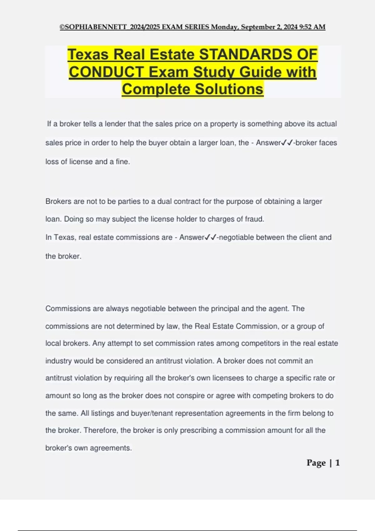 Texas Real Estate STANDARDS OF CONDUCT Exam Study Guide with Complete Solutions If a broker tells a lender that the sales price on a property is something above its actual sales price in order to help the buyer obtain a larger loan, the - Answer️️ -broker faces loss of license and a fine. Brokers are not to be parties to a dual contract for the purpose of obtaining a larger loan. Doing so may subject the license holder to charges of fraud. In Texas, real estate commissions are - Answer️️ -negotiable between the client and the broker. Commissions are always negotiable between the principal and the agent. The commissions are not determined by law, the Real Estate Commission, or a group of local brokers. Any attempt to set commission rates among competitors in the real estate industry would be considered an antitrust violation. A broker does not commit an antitrust violation by requiring all the broker's own licensees to charge a specific rate or amount so long as the broker does not conspire or agree with competing brokers to do the same. All listings and buyer/tenant representation agreements in the firm belong to the broker. Therefore, the broker is only prescribing a commission amount for all the broker's own agreements. ©SOPHIABENNETT_2024/2025 EXAM SERIES Monday, September 2, 2024 9:52 AM Page | 2 Regarding listing agreements in Texas, which of the following might result in the suspension or revocation of an individual's real estate license? - Answer️️ -no definite termination date. Listings must have a definite termination date not subject to prior notice. Net listings are - Answer️️ -is permitted in Texas but discouraged. Net listings are legal but discouraged because of a potential conflict of interest. Net listings are permitted by TREC only when the principal (1) requires a net listing and (2) where the principal appears to be familiar with current market values. Additionally, when negotiating any listing, net or otherwise, or even offering to purchase the property on the licensee's own account as a result of a contact made while acting as a real estate agent, a "licensee is obligated to advise a property owner as to the licensee's opinion of market value of a property." The License Act requires that every listing - Answer️️ -has a definite termination date. All listings must specify a definite period during which the broker is to be employed and must have a definite termination date. Texas statute prohibits the use of automatic extensions of time in listing agreements. All of the following are violations of the Texas Real Estate Licensing Act EXCEPT ©SOPHIABENNETT_2024/2025 EXAM SERIES Monday, September 2, 2024 9:52 AM Page | 3 A)failing to disclose to a potential purchaser any latent structural defects known to the license holder. B)receiving a commission without the knowledge and consent of the license holder's client. C)encouraging a seller to reject an offer because the of the prospective buyer's religion. D)placing a For Sale sign in front of a house after receiving written permission to post the sign. - Answer️️ -placing a For Sale sign in front of a house after receiving written permission to post the sign. A broker must always have written consent to erect a For Sale or lease sign on a property. In Texas, real estate brokers or salespersons A)must disclose to a buyer's agent that their client wil